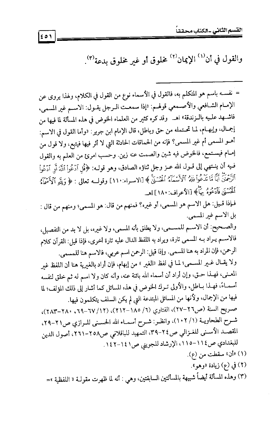 والقول في أن الإيمان مخلوق أو غير مخلوق بدعة.