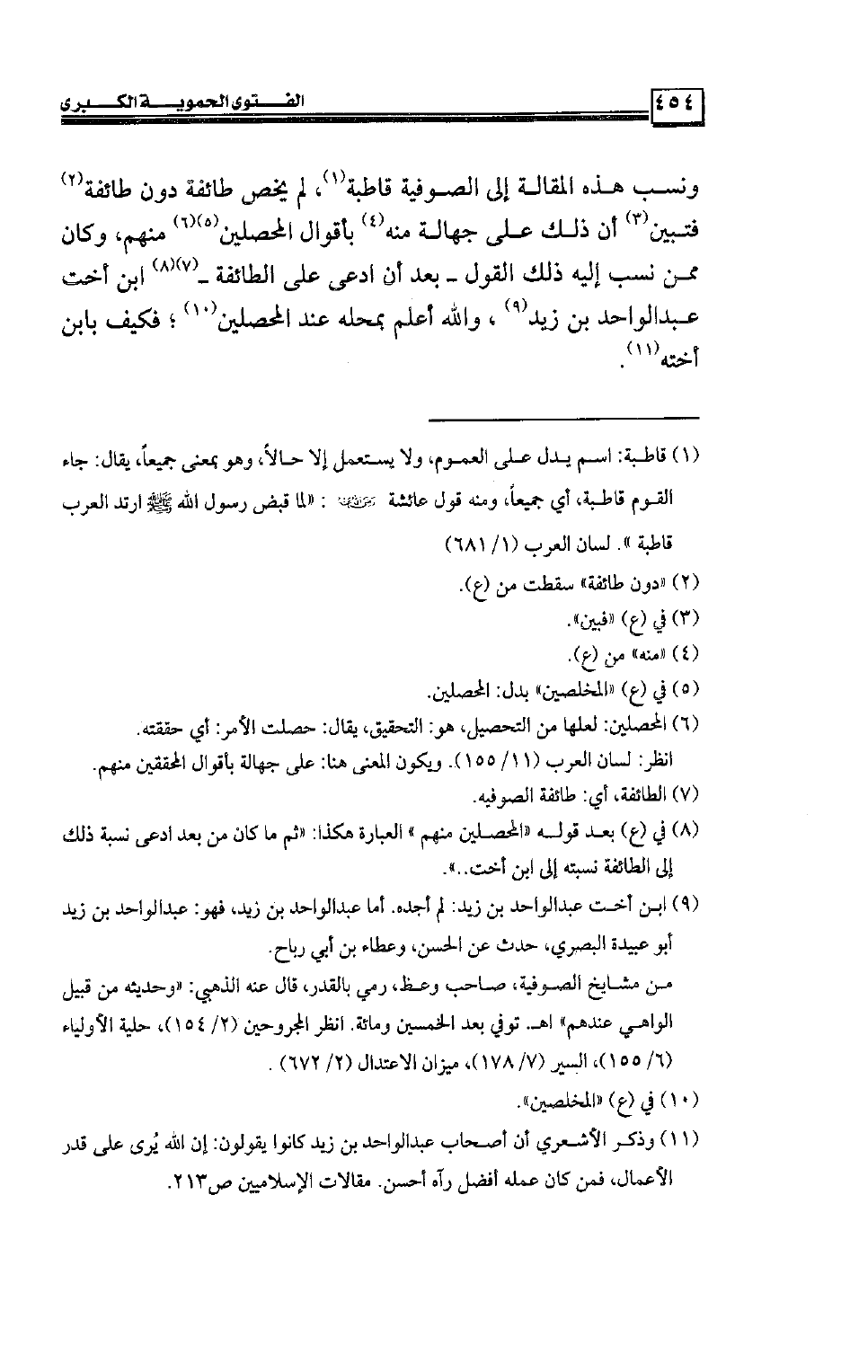 ونسب هذه المقالة إلى الصوفية قاطبة، لم يخص طائفة دون طائفة فتبين أن ذلك على جهالة منه بأقوال المحصلين منهم، وكان ممن نسب إليه ذلك القول ـ بعد أن ادعى على الطائفة ـ ابن أخت عبد الواحد بن زيد، والله أعلم بمحله عند المحصلين؛ فكيف بابن أخته.