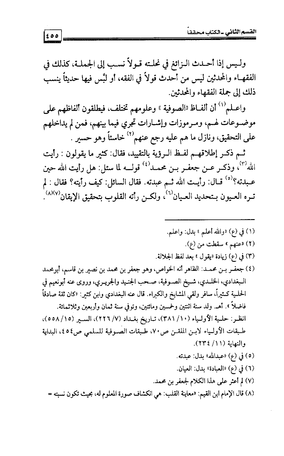 ثم ذكر إطلاقهم لفظ الرؤية بالتقييد، فقال: كثير ما يقولون: رأيت الله، وذكر عن جعفر بن محمد قوله لما سئل: هل رأيت الله حين عبدته؟ قال: رأيت الله ثم عبدته. فقال السائل: كيف رأيته؟ فقال: لم تره العيون بتحديد العيان، ولكن رأته القلوب بتحقيق الإيقان.
