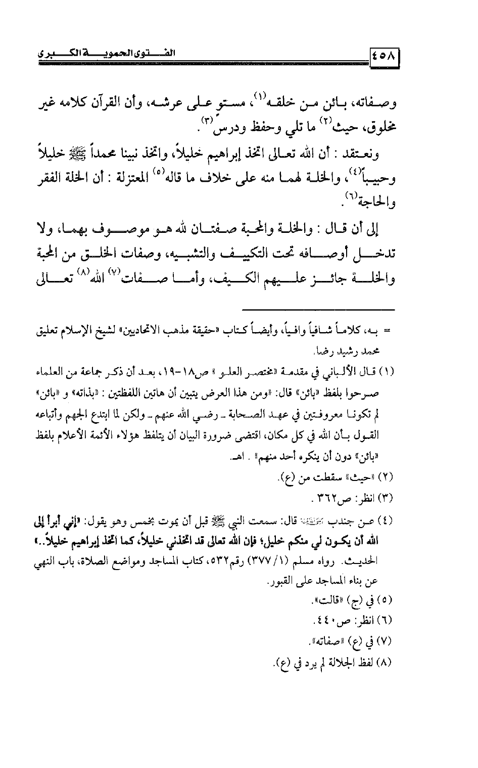 إلى أن قال: والخلة والمحبة صفتان لله هو موصوف بهما، ولا تدخل أوصافه تحت التكييف والتشبيه، وصفات الخلق من المحبة والخلة جائز عليهم الكيف، وأما صفات الله تعالى