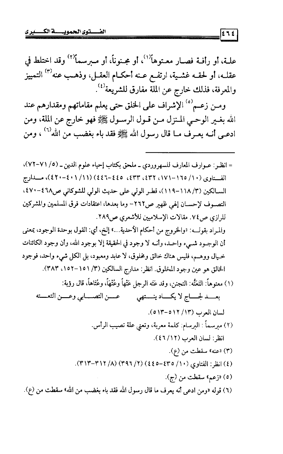 علة، أو رأفة فصار معتوهًا، أو مجنونًا، أو مبرسمًا وقد اختلط في عقله، أو لحقه غشية، ارتفع عنه أحكام العقل، وذهب عنه التمييز والمعرفة، فذلك خارج عن الملة مفارق للشريعة.