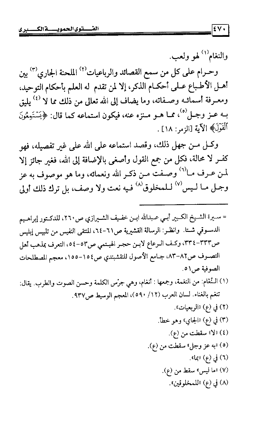 وحرام على كل من سمع القصائد والربعيات الملحنة الجاري بين أهل الأطباع على أحكام الذكر، إلا لمن تقدم له العلم بأحكام التوحيد، ومعرفة أسمائه وصفاته، وما يضاف إلى الله تعالى من ذلك مما لا يليق به عز وجل، مما هو منزه عنه، فيكون استماعه كما قال: {يَسْتَمِعُونَ الْقَوْلَ} الآية [الزمر: 18] .