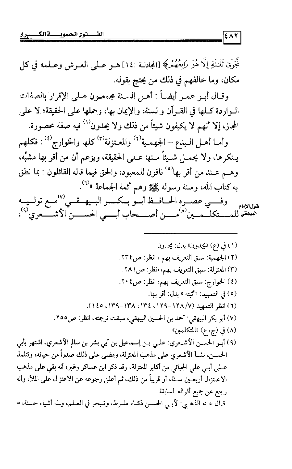 وقال أبوعمر أيضًا: أهل السنة مجمعون على الإقرار بالصفات الواردة كلها في القرآن والسنة، والإيمان بها، وحملها على الحقيقة؛ لا على المجاز، إلا أنهم لا يكيفون شيئًا من ذلك، ولا يَحُدُّون فيه صفة محصورة.