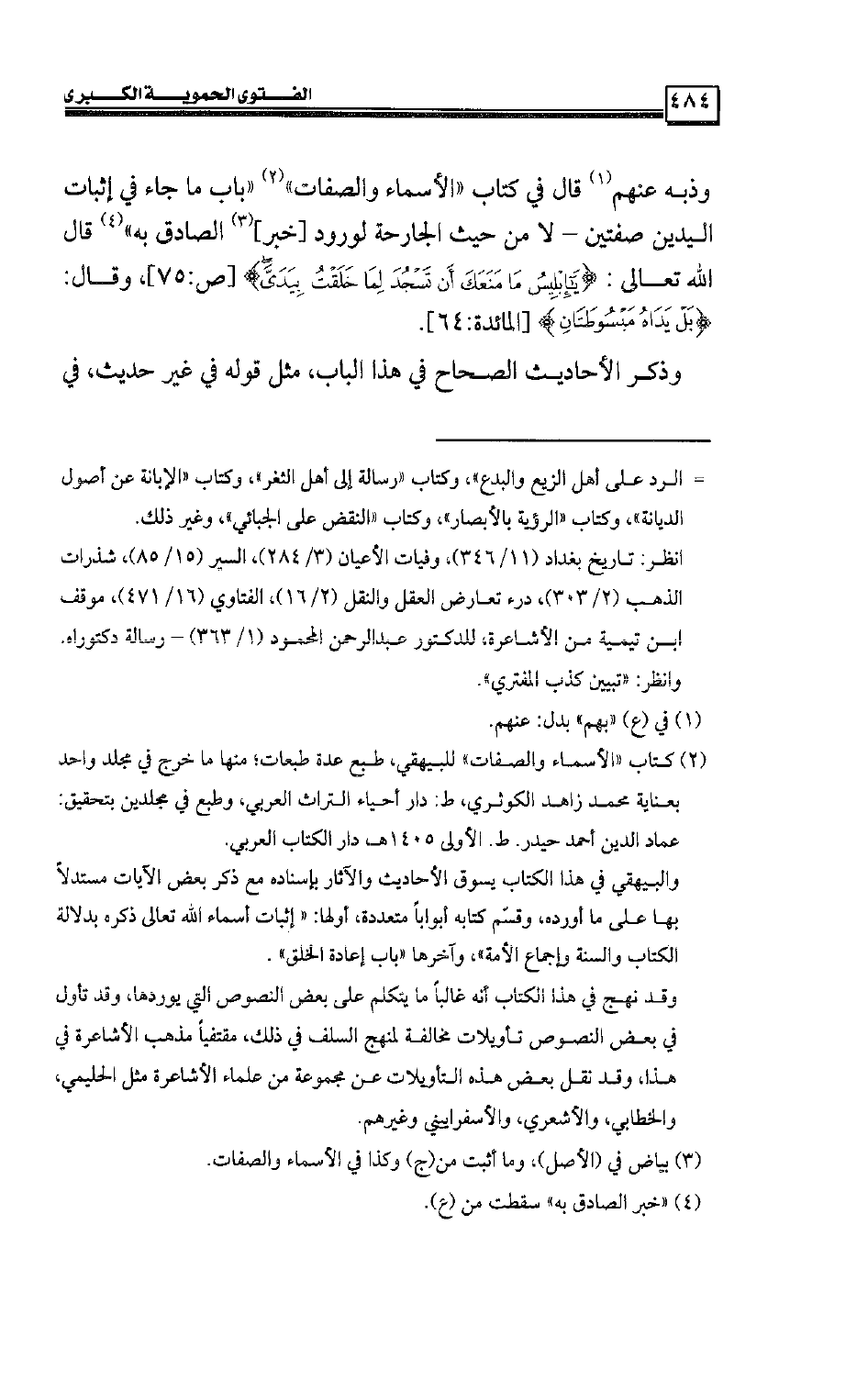 وذبه عنهم قال: في كتاب «الأسماء والصفات» «باب ما جاء في إثبات اليدين صفتين ـ لا من حيث الجارحة لورود [خبر] الصادق به» قال الله تعالى: {يَا إِبْلِيسُ مَا مَنَعَكَ أَن تَسْجُدَ لِمَا خَلَقْتُ بِيَدَيَّ} [ص:75] ، وقال: {بَلْ يَدَاهُ مَبْسُوطَتَانِ} [المائدة:46] .