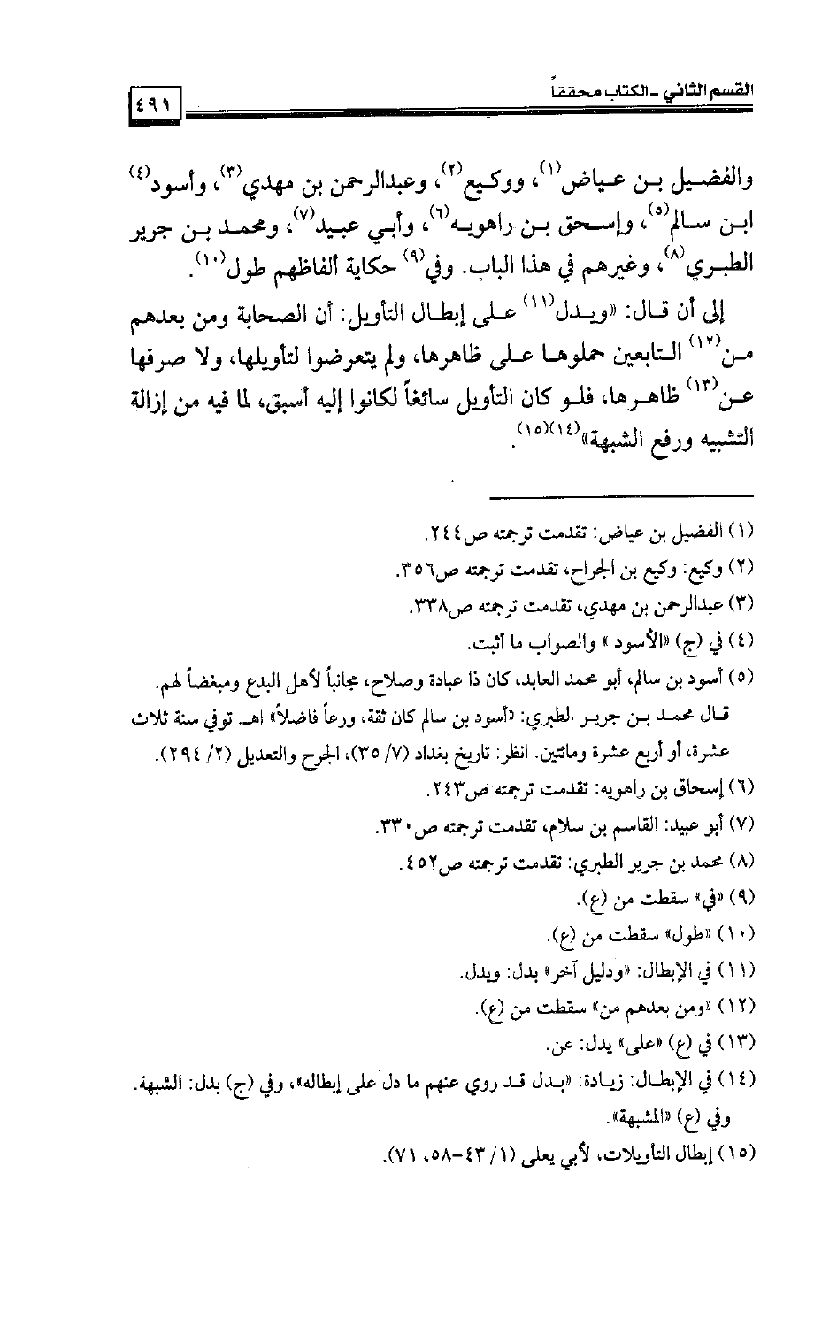 والفضيل بن عياض، ووَكِيع، وعبد الرحمن بن مهدي، وأسود بن سالم، وإسحاق بن راهويه، وأبي عبيد، ومحمد بن جرير الطبري، وغيرهم في هذا الباب. وفي حكاية ألفاظهم طول.