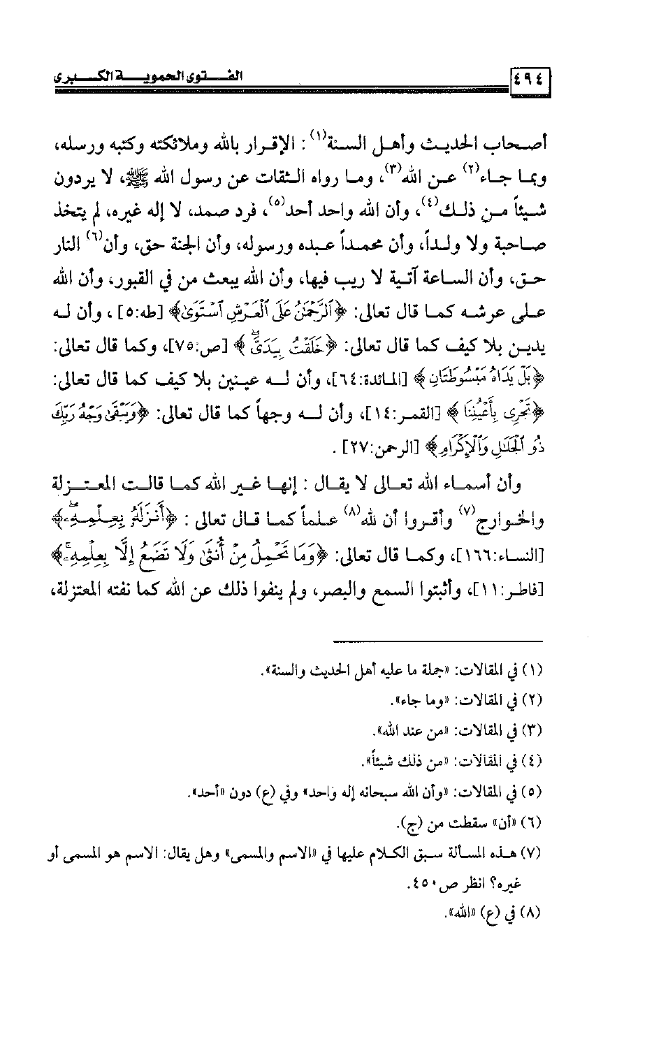 وأن أسماء الله تعالى لا يقال: إنها غير الله كما قالت المعتزلة والخوارج وأقروا أن لله علمًا، كما قال تعالى: {أَنزَلَهُ بِعِلْمِهِ} [النساء:166] ، وكما قال تعالى: {وَمَا تَحْمِلُ مِنْ أُنثَى وَلَا تَضَعُ إِلَّا بِعِلْمِهِ} [فاطر:11] ، وأثبتوا السمع والبصر، ولم ينفوا ذلك عن الله كما نفته المعتزلة،