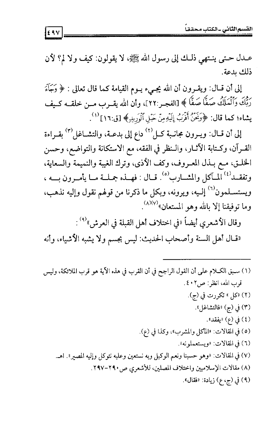 إلى أن قال: ويقرون أن الله يجيء يوم القيامة كما قال تعالى: {وَجَاءَ رَبُّكَ وَالْمَلَكُ صَفًّا صَفًّا} [الفجر:22] ، وأن الله يقرب من خلقه كيف يشاء؛ كما قال: {وَنَحْنُ أَقْرَبُ إِلَيْهِ مِنْ حَبْلِ الْوَرِيدِ} [ق:16] .
