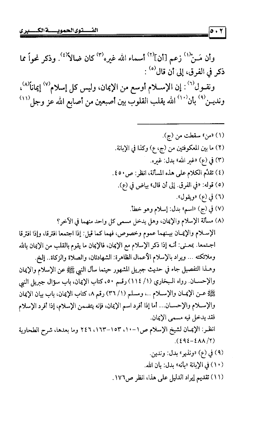 ونقول: إن الإسلام أوسع من الإيمان، وليس كل إسلام إيمانًا، وندين بأن الله يقلب القلوب بين إصبعين من أصابع الله عز وجل