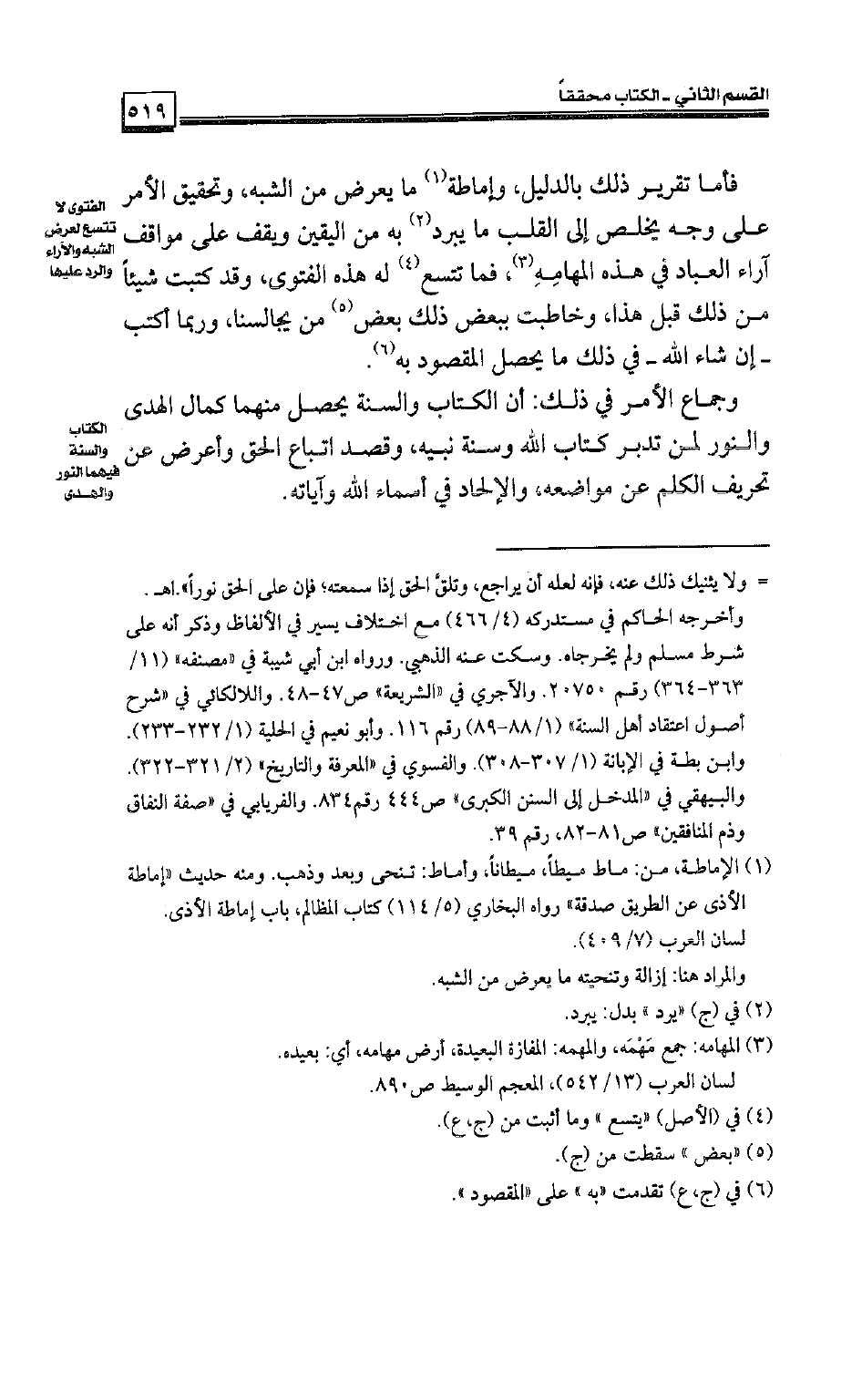 وجماع الأمر في ذلك: أن الكتاب والسنة يحصل منهما كمال الهدى والنور لمن تدبر كتاب الله وسنة نبيه، وقصد اتباع الحق، وأعرض عن تحريف الكلم عن مواضعه، والإلحاد في أسماء الله وآياته.