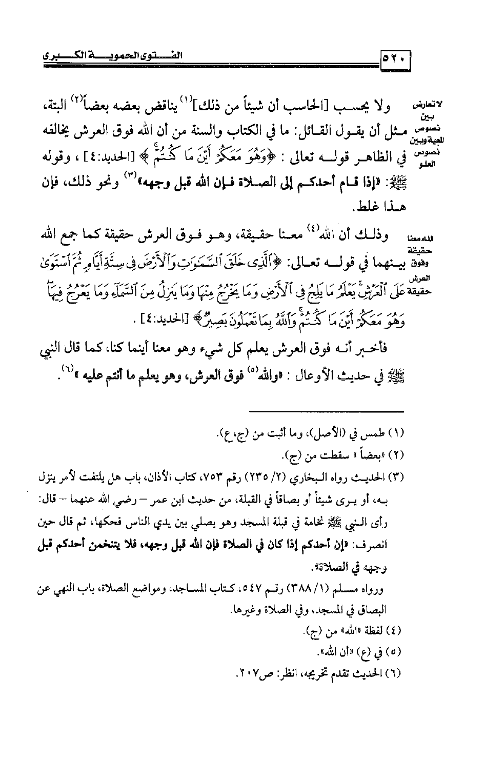 ولا يحسب [الحاسب أن شيئًا من ذلك] يناقض بعضه بعضًا البتة، مثل أن يقول القائل: ما في الكتاب والسنة من أن الله فوق العرش يخالفه في الظاهر قوله تعالى: {وَهُوَ مَعَكُمْ أَيْنَ مَا كُنتُمْ} [الحديد:4] ، وقوله صلى الله عليه وسلم: «إذا قام أحدكم إلى الصلاة فإن الله قِبَل وجهه» ونحو ذلك، فإن هذا غلط.
