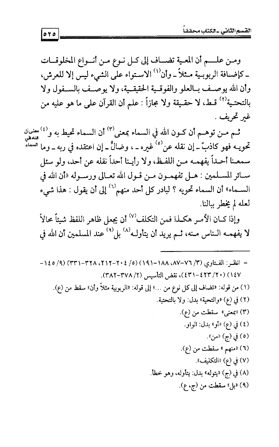 ومن علم أن المعية تضاف إلى كل نوع من أنواع المخلوقات ـ كإضافة الربوبية مثلاً ـ وأن الاستواء على الشيء ليس إلا للعرش، وأن الله يوصف بالعلو والفوقية الحقيقية، ولا يوصف بالسفول ولا بالتحتية قط، لا حقيقة ولا مجازًا: علم أن القرآن على ما هو عليه من غير تحريف.