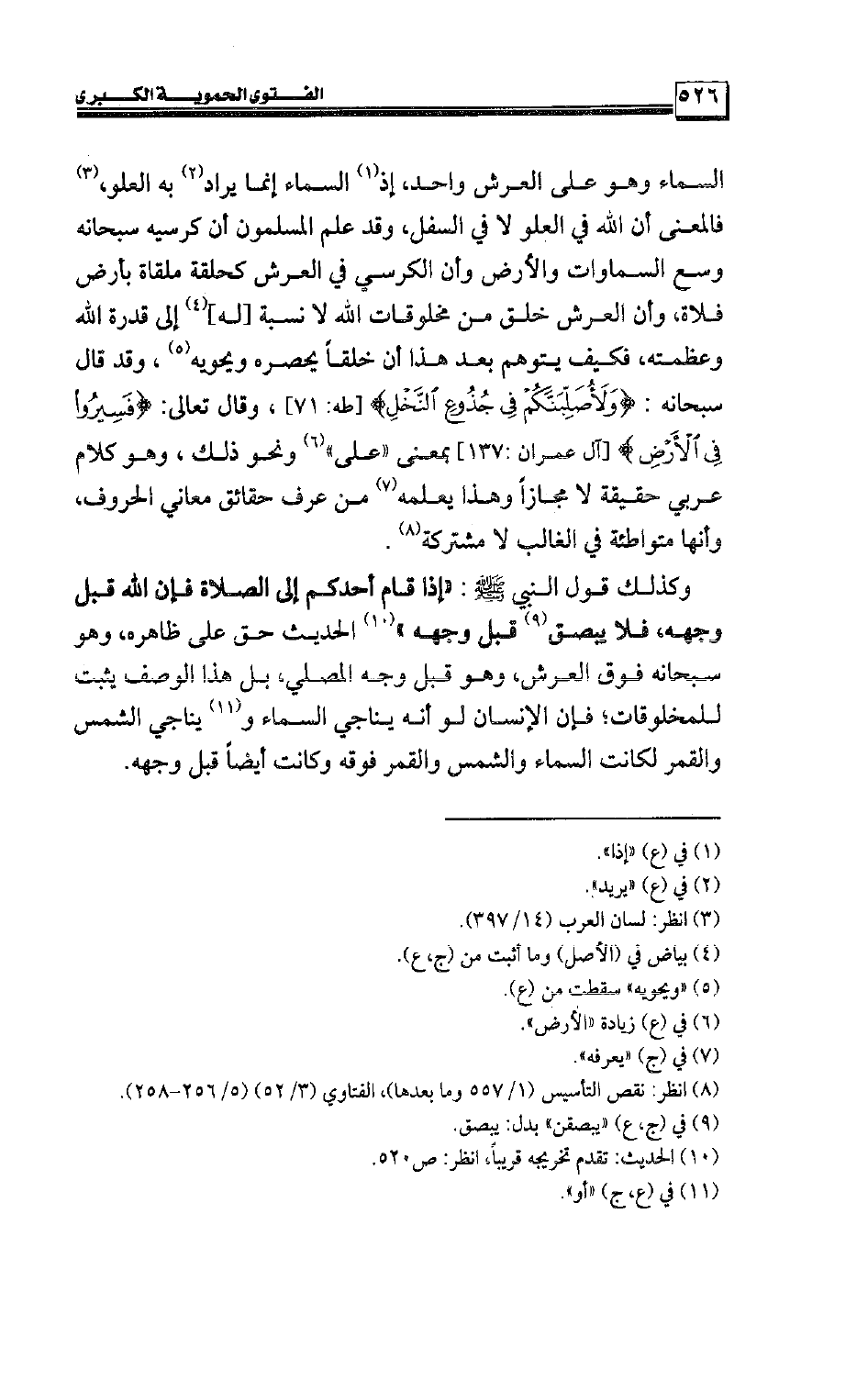 وكذلك قول النبي صلى الله عليه وسلم: «إذا قام أحدكم إلى الصلاة فإن الله قبل وجهه، فلا يبصق قبل وجهه» الحديث حق على ظاهره، وهو سبحانه فوق العرش، وهو قبل وجه المصلي، بل هذا الوصف يثبت للمخلوقات؛ فإن الإنسان لو أنه يناجي السماء ويناجي الشمس والقمر لكانت السماء والشمس والقمر فوقه وكانت أيضًا قبل وجهه.