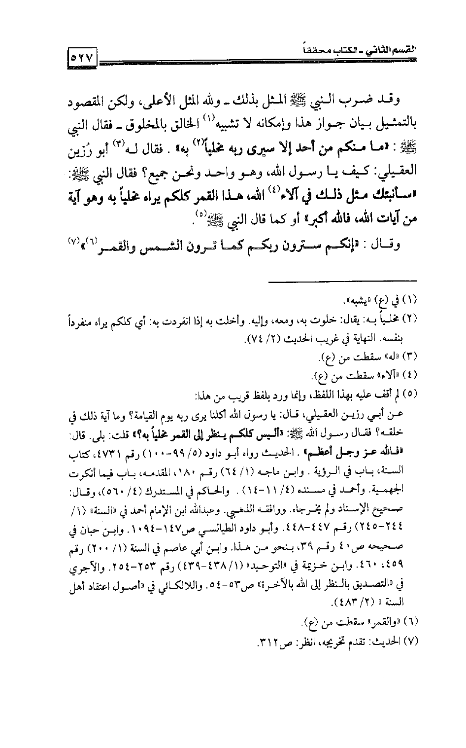 وقد ضرب النبي صلى الله عليه وسلم المثل بذلك ـ ولله المثل الأعلى، ولكن المقصود بالتمثيل بيان جواز هذا وإمكانه لا تشبيه الخالق بالمخلوق ـ فقال النبي صلى الله عليه وسلم: «ما منكم من أحد إلا سيرى ربه مخليًا به» . فقال له أبو رُزين العقيلي: كيف يا رسول الله، وهو واحد ونحن جميع؟ فقال النبي صلى الله عليه وسلم: «سأنبئك مثل ذلك في آلاء الله، هذا القمر كلكم يراه مخليًا به وهو آية من آيات الله، فالله أكبر» أو كما قال النبي صلى الله عليه وسلم.