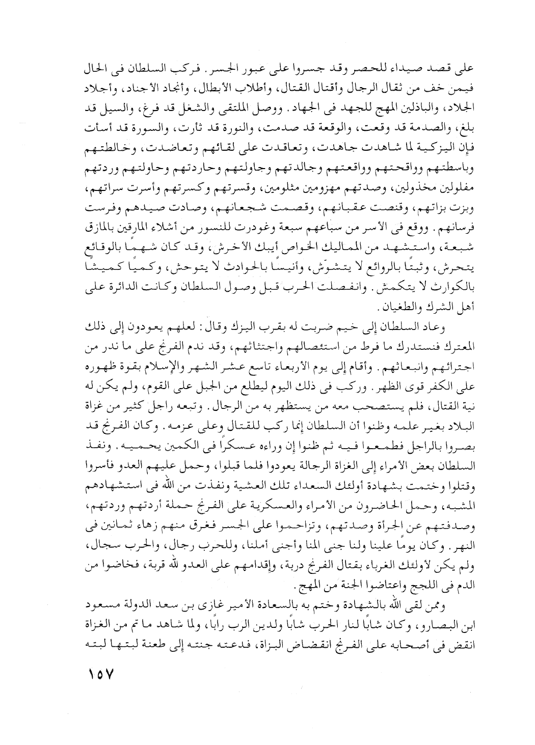 وممن لقي بالشهادة؛ وختم له بالسعادة؛ (الأمير غازي بن سعد الدولة مسعود بن البصارو) كان شابا لنار الحرب شابا، ولدين الرب رابا. ولما شاهد ما تم من الغزاة؛ انقض في أصحابه على الفرنج انقضاض البزاة. فدعته حنته، وإلى طعنة لبتها لبته.