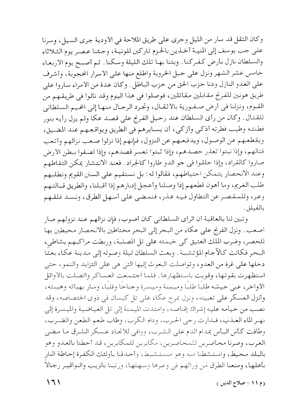 وبعث السلطان ليلة وصوله إلى مدينة عكاء بعثا دخلها على غرة من العدو، وتواصلت البعوث إليها التي هي على التزايد والنمو. حتى استظهرت بغوتها، وقويت باستظهارها. فلما اجتمعت العساكر واتصلت الأوائل بالأواخر؛ عبي جيشه طلبا طلبا، وميمنة وميسرة وجناحا وقلبا. وسار بهيئته وهيبته، وانزل العسكر على تعبيته. ونزل بمرج عكاء على تل كيسان في ذوي اختصاصه، وقد نصب من خيامه عليه اشراك اقناصه. وامتدت الميمنة إلى تل العياضية والميسرة إلى نهر الماء العذب.