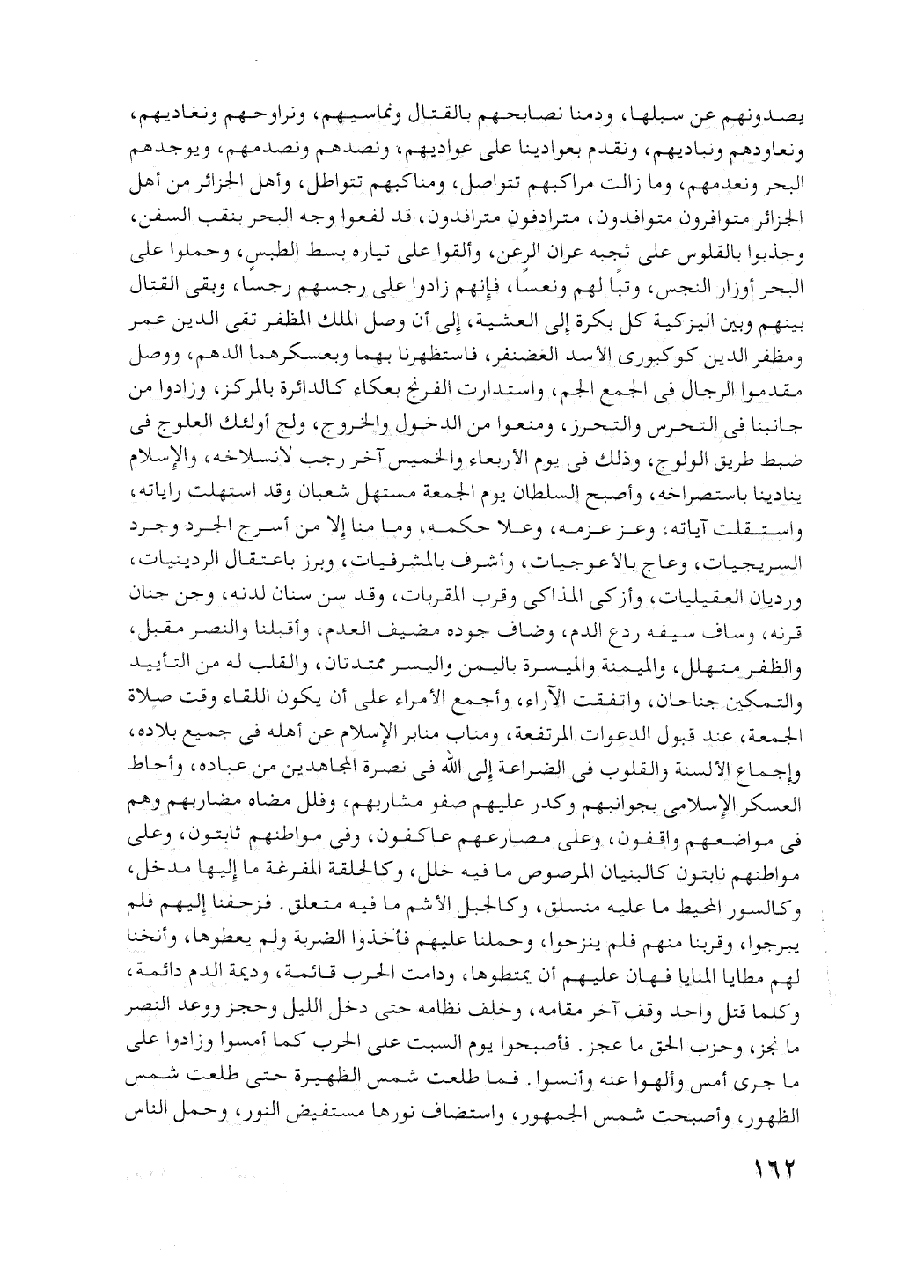 يكون اللقاء وقت صلاة الجمعة، عند قبول الدعوات المرتفعة. ومناب منابر الإسلام عن أهله في جميع بلاده، وإجماع الألسنة والقلوب في الضراعة إلى الله في نصرة المجاهدين من عباده. وأحاط العسكر الإسلامي بجوانبهم. وكدر عليهم صفو مشاربهم، وفلل مضاء مضاربهم. وهم في وضعهم واقفون، وعلى مصارعهم عاكفون، وفي مواطنهم ثابتون. وعلى مواطئهم نابتون كالبنيان المرصوص ما فيه خلل، وكالحلقة المفرغة ما إليها مدخل. وكالسور المحيط ما عليه متسلق، وكالجبل الأشم ما فيه متعلق. فزحفنا إليهم فلم يبرحوا، وقربنا منهم فلم ينزحوا. وحملنا عليهم فأخذوا الضربة ولم يعطوها، وأنخنا لهم مطايا المنايا فهان عليهم أن يمتطوها. ودامت الحرب قائمة، وديمة الدم دائمة. وكلما قتل واحد وقف آخر مقامه، وخلف نظامه. حتى دخل الليل وحجز، ووعد النصر ما نجز، وحزب الحق ما عجز.