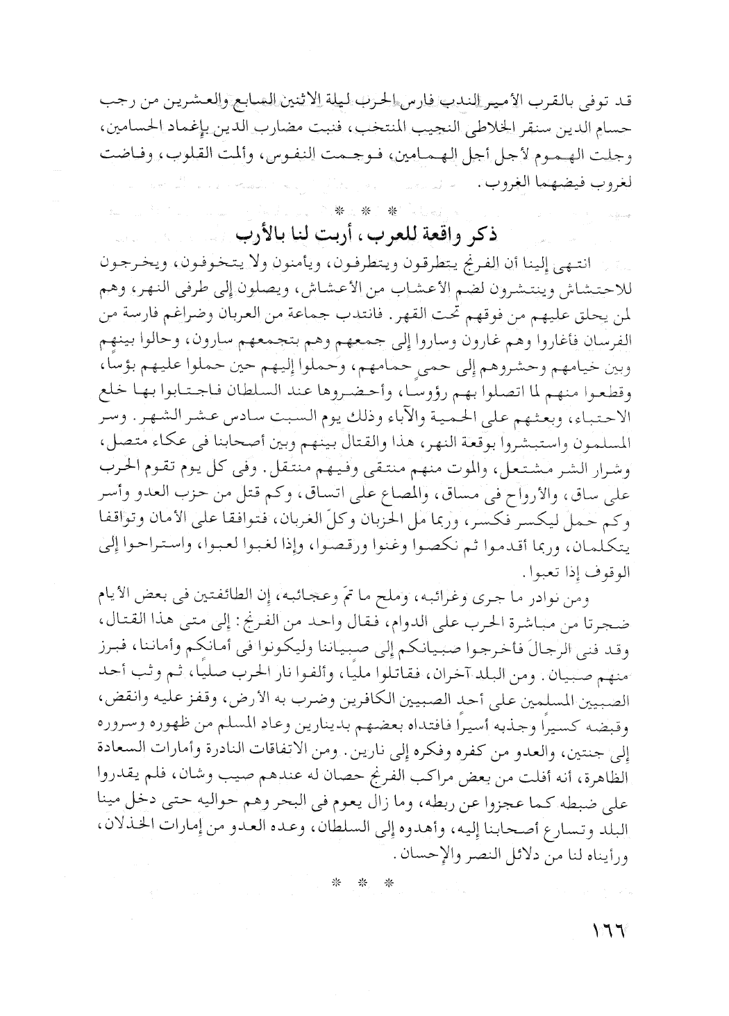 انتهى إلينا أن الفرنج يتطرقون ويتطرفون، ويأمنون ولا يتخوفون. . ويخرجون للاحتشاش، وينتشرون لضم الأعشاب من الأعشاش. ويصلون إلى طرفي النهر وهم لمن يحلق عليهم من فوقهم تحت القهر. فانتدب جماعة من العربان، وضراغم فارسة من الفرسان. فأغاروا وهم غارون، وساروا إلى جمعهم وهم بتجميعهم سارون. وحالوا بينهم وبين خيامهم، وحشروهم إلى حمى حمامهم. وحملوا إليهم حين حملوا عليهم بؤسا، وقطعوا منهم لما اتصلوا بهم رءوسا. وأحضروها عند السلطان فاجتابوا بها خلع الاجتباء، وبعثهم على الحمية والإباء. وذلك يوم السبت ثالث عشر الشهر. ومسر المسلمون واستبشروا بوقعة النهر. هذا والقتال بينهم وبين أصحابنا في عكاء متصل، وشرار الشر مشتعل، والموت منهم منتق وفيهم منتقل. وفي كل يوم تقوم الحرب على ساق، والأرواح في مساق، والمصاع على اتساق. وكم قتل من حزب العدو وأسر، وكم حمل ليكسر فكسر. وربما مل الحزبان، وكل الغربان، فتوافقا على الأمان، وتوافقا يتكلمان. وربما أقدموا ثم نكصوا، وغنوا ورقصوا. وإذا لغبوا لعبوا واستراحوا إلى الوقوف إذا تعبوا.
