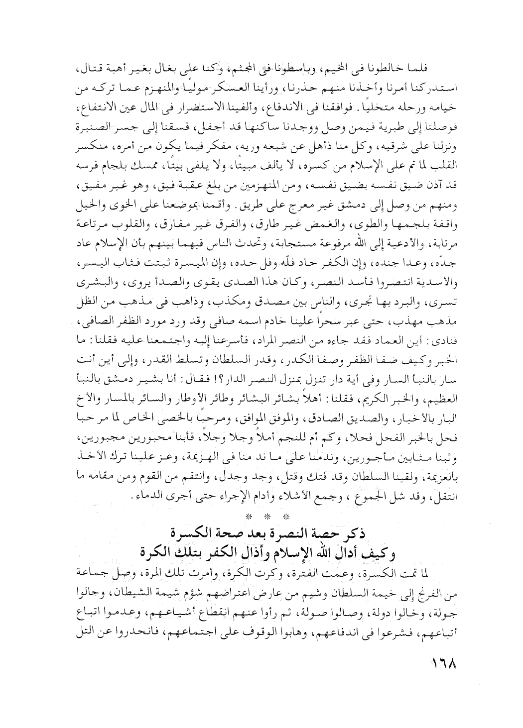 فأسرعنا إليه، واجتمعنا عليه. فقلنا: ما الخبر، وكيف ضفا الظفر، وصفا الكدر. وقدر السلطان وتسلط القدر، وإلى أين أنت سار بالنبأ السار، وفي أية دار تنزل بمنزل النصر الدار فقال: أنا بشير دمق بالنبأ العظيم، والخبر الكريم. فقلنا أهلا