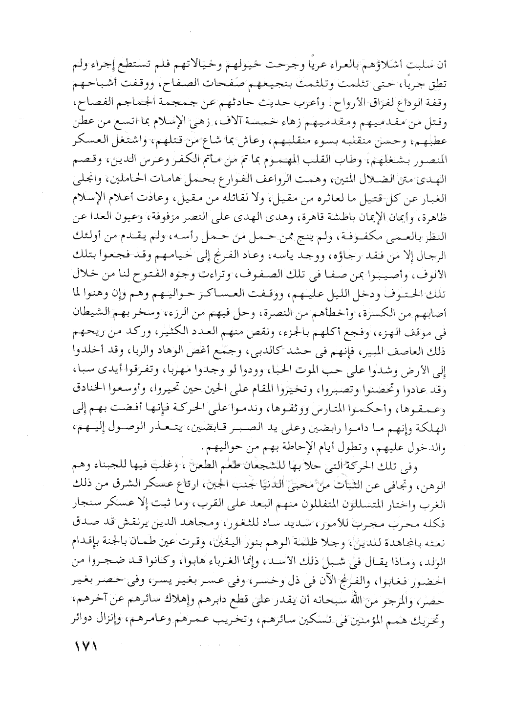 وطاب القلب المهموم بما تم من مأتم الكفر وعرس الدين، وقصم الهدى متن الضلال المتين، وهمت الرواعف الفوارع بحمل هامات الحاملين. وانجلى الغبار عن كل قتيل ما لعاثره من مقيل، ولا لقائله من مقيل. وعادت أعلام الإسلام ظاهرة، وإيمان الإيمان باطشة قاهرة. وهدى الهدى على النصر مزفوفة، وعيون العدا عن النظر بالعمى مكفوفة. ولم ينج ممن حمل من حمل راسه، ولم يقدم من