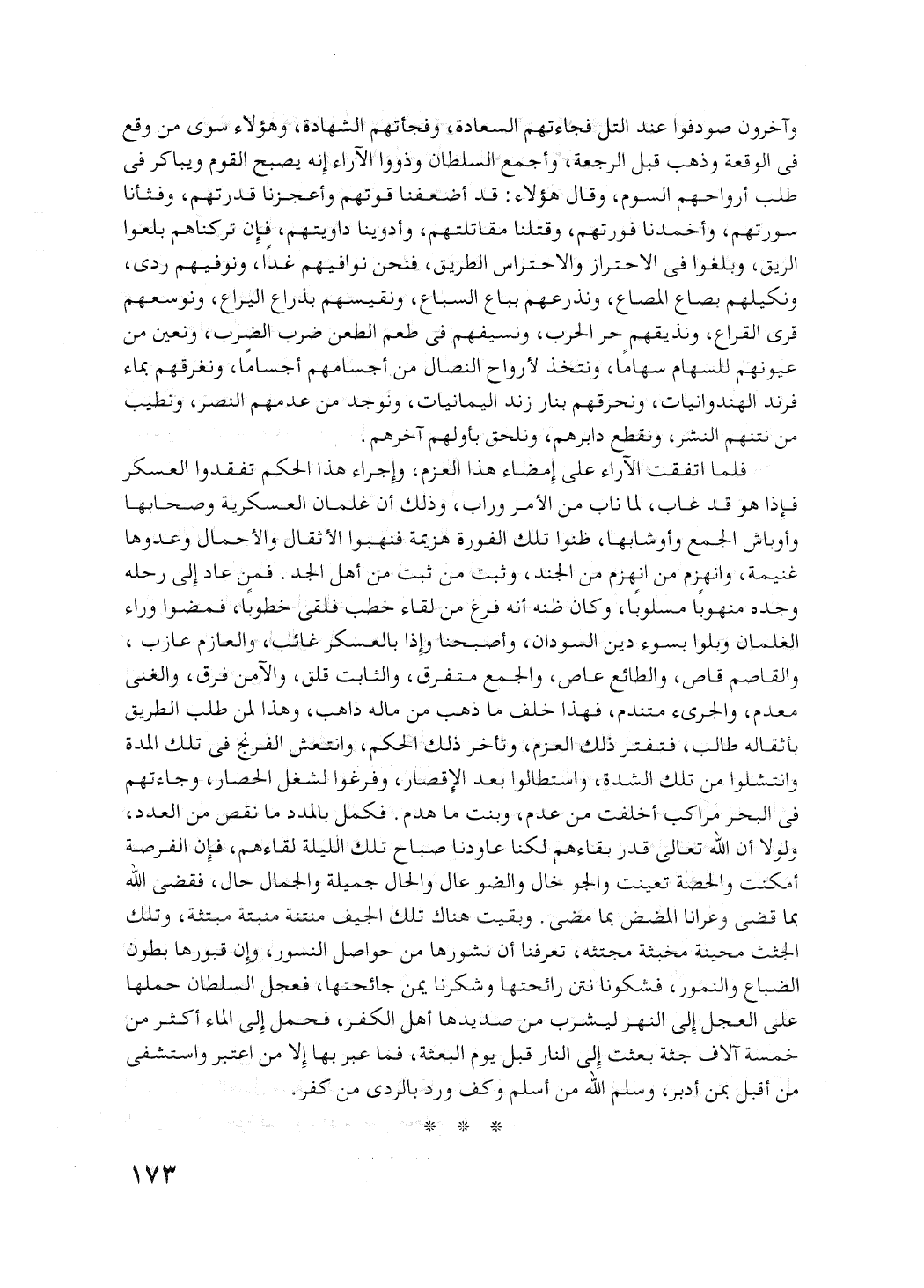 وبقيت تلك الجيف منتنة مبتثة، وتلك الجثث محينة مخبثة مجتثة. تعرفنا أن نشورها من حواصل النسور، وأن قبورها بطون الضباع والنمور. فشكونا نتن رائحتها، وشكرنا بمن جائحتها. فجعل السلطان حملها على العجل إلى النهر، ليشرب من صديدها أهل الكفر. فحمل إلى الماء أكثر من خمسة آلاف جثة، بعث إلى النار قبل يوم البعثة. فما عبر بها إلا من اعتبر، واستشفى من أقبل بمن أدبر. وسلم الله من أسلم، وكف ورد بالردى من كفر.