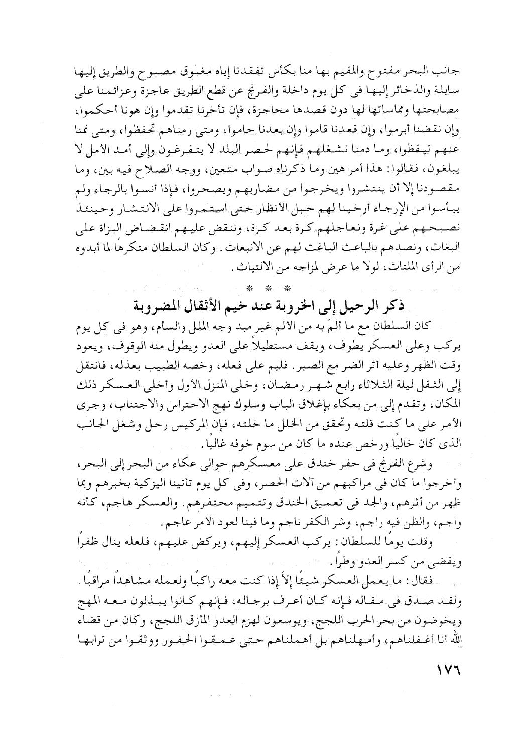 كان السلطان مع ما ألم به من الألم، غير مبد وجه الملل والسأم. وهو في كل يوم يركب وعلى العسكر يطوف، ويقف مستطيلا على العدو ويطول منه الوقوف. ويعود وقت الظهر، وعليه أثر الضر من الصبر. فليم على فعله، وخصه الطبيب بعذله. فانتقل إلى الثقل ليلة الثلاثاء رابع شهر رمضان، وخلى المنزل الأول وأخلى العسكر ذلك المكان. وتقدم إلى من بعكاء بإغلاق الباب، وسلوك نهج الاحتراس والاجتناب. وجرى الأمر على ما كنت قلته، وتحقق من الخلل ما خلته.