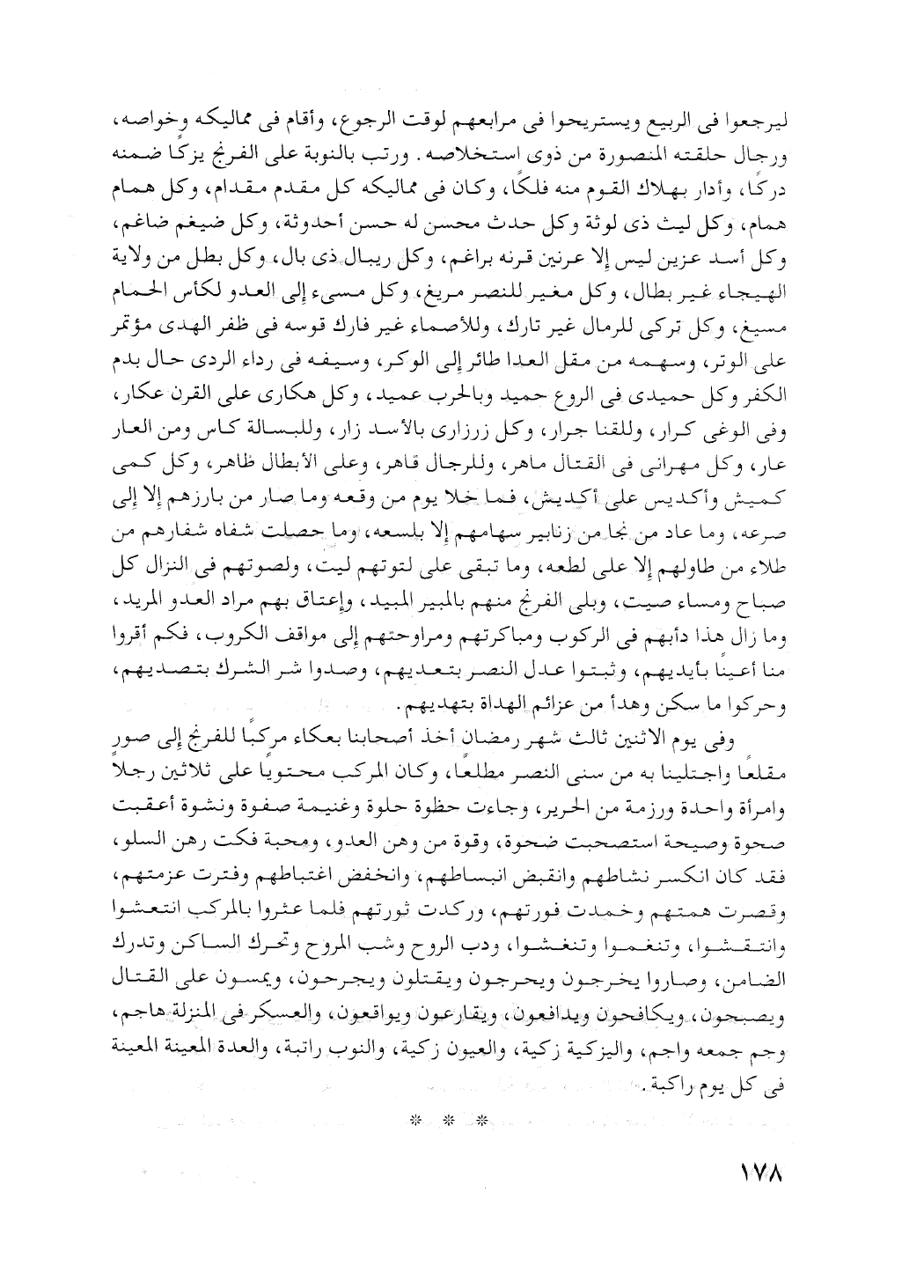 وما زال هذا دأبهم في الركوب، ومباركتهم ومراوحتهم إلى مواقف الكروب. فكم اقروا منا أعينا بأيديهم، وثبتوا عدل النصر بتعديهم، وصلوا شر الشرك بتصديهم، وحركوا ما سكن وهدأ من عزائم الهداة بتهديهم.