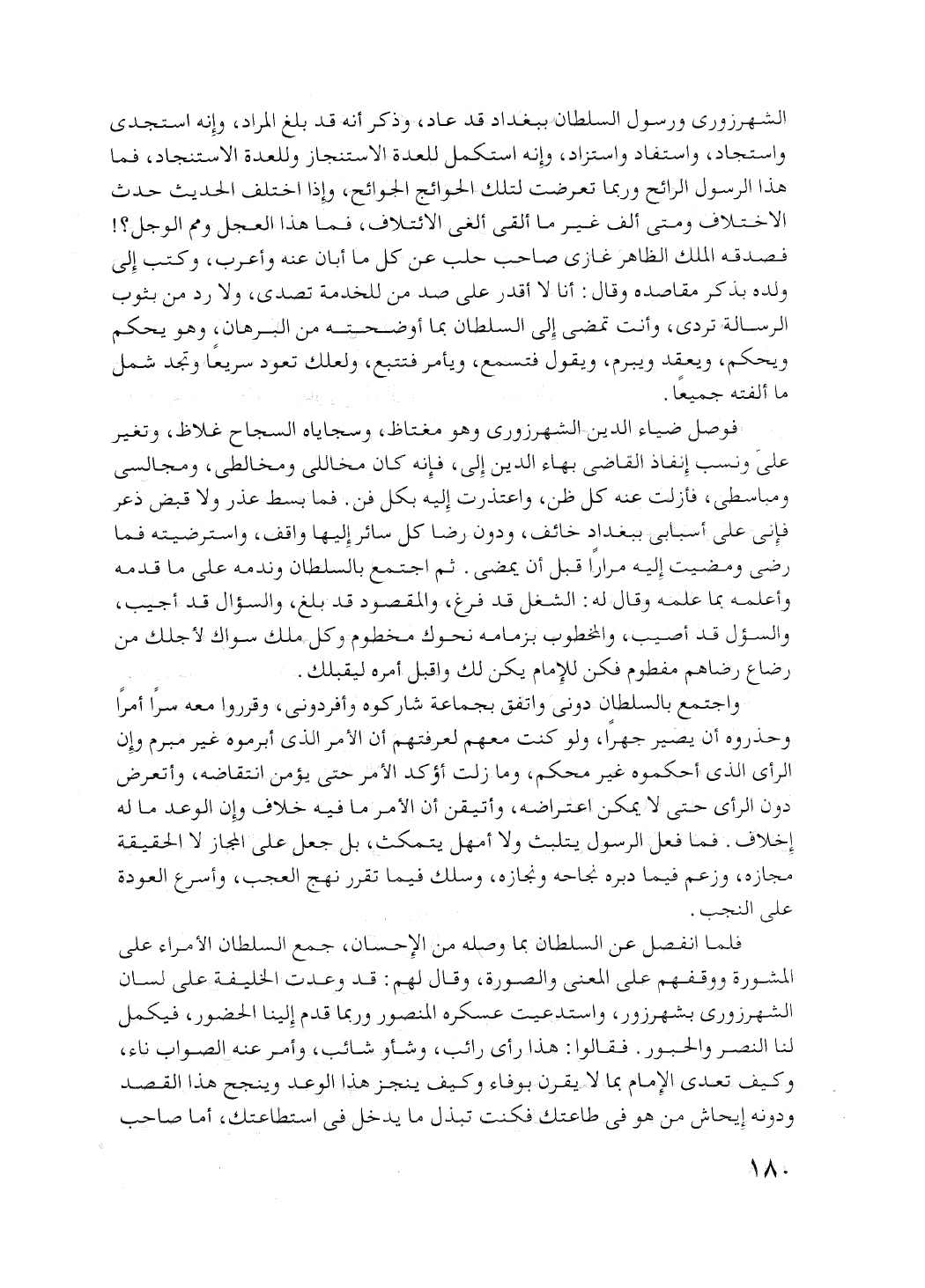 الشهرزوري رسول السلطان ببغداد قد عاد، وذكر أنه قد بلغ المراد، وأنه استجدى واستجاد، واستفاد واستزاد، وأنه استكمل للعدة الاستنجاز، وللعدة الاستنجاد.