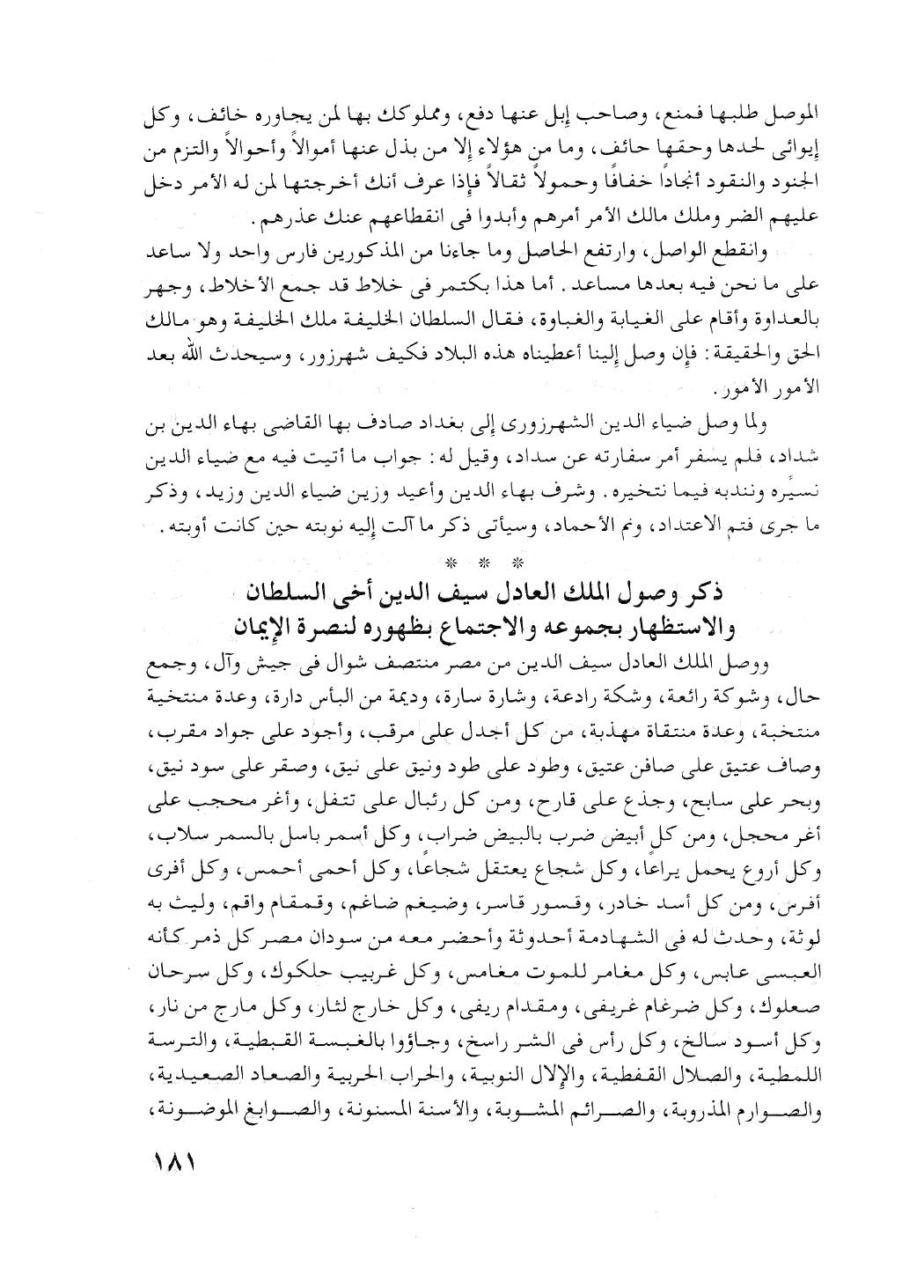 ووصل الملك العادل سيف الدين من مصر منتصف شوال، في جيش آل، وجمع حال. وشوكة رائعة وشكة رادعة، وشارة سارة، وديمة من البأس دارة. وعدة منتخية منتخبة، وعدة منتقاة مهذبة. من كل أجدل على مرقب، وأجود على جواد مقرب. وصاف عتيق على صافن عتيق، وطود على طود ونيق على نيق، وصقر على سوذنيق. وبحر على صابح، وجذع على قارح. ومن كل رئبال على تتفل، وأغر محجب على أغر محجل. ومن كل أبيض ضرب بالبيض ضراب، وكل أسمر باسل بالسمر سلاب، وكل أروع يحمل يراعا، وكل شجاع يعتقل شجاعا. وكل أحمى أحمس، وكل أفرى أفرس. ومن كل أسد خادر، وقسور قاسر. وضيغهم ضاغم، وقمقام واقم. وليث به لوثة، وحدث له في الشهامة أحدوثة.