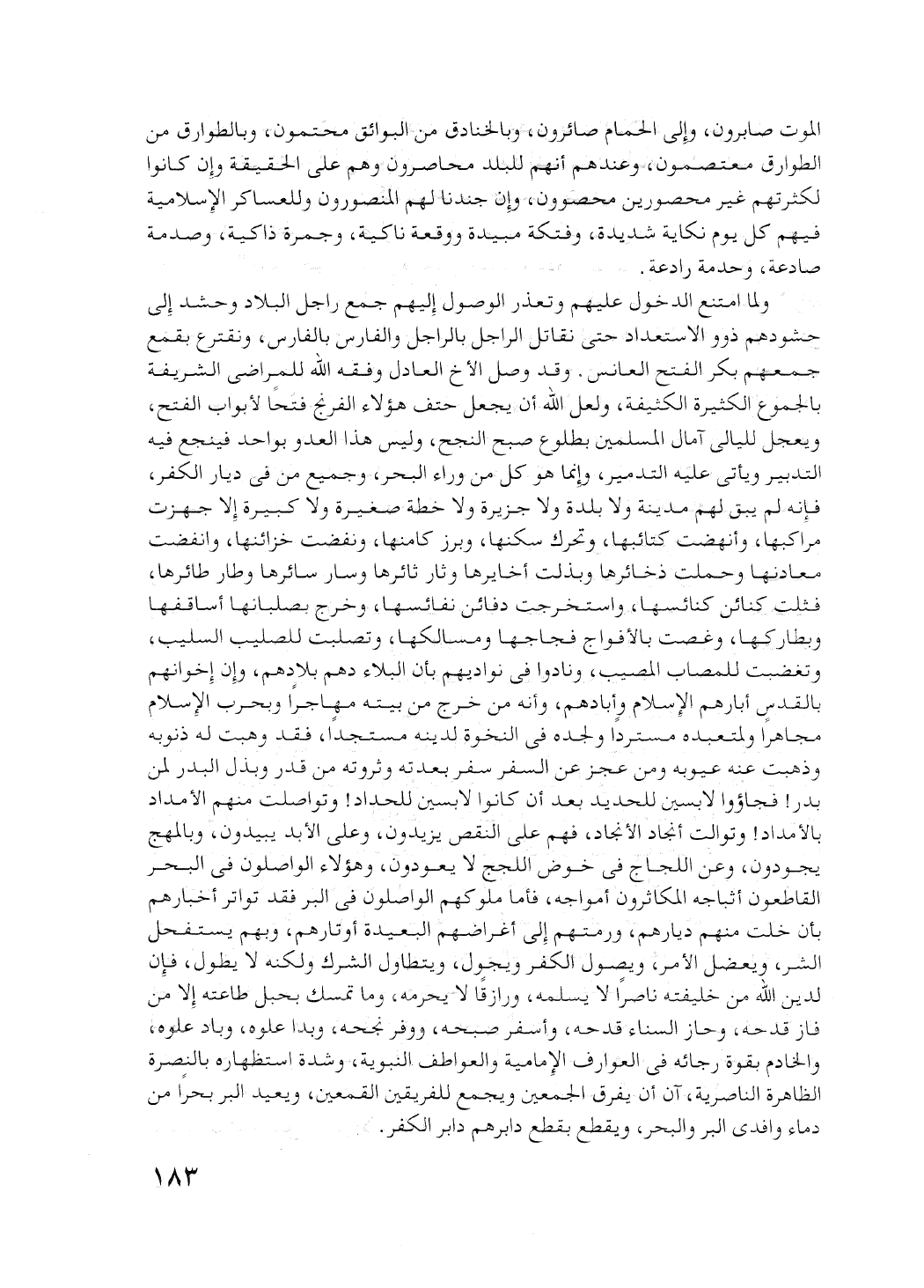وهؤلاء هم الواصلون في البحر القاطعون اثباجه، المكاثرون أمواجه. فأما ملوكهم الواصلون في البر فقد تواترت أخبارهم، بأن خلت منهم ديارهم؛ ورمتهم إلى أغراضهم البعيدة أوتارهم. وبهم يستفحل الشر، وبعضل الأمر. ويصول الكفر ويجول؛ ويتطاول الشرك ولكنه لا يطول. فإن لدين الله من خليفته ناصرا لا يسلمه، ورازقا لا يحرمه. وما تمسك بحبل طاعنه الا من فاز قدحه وحاز السناء قدحه، وأسفر صبحه، ووفر نجحه. وبدا علوه، وباد عدوه. والخادم بقوة رجائه في العوارف الامامية؛ والعواطف النبوية؛ وشدة استظهاره بالنصرة الظاهرة الناصرية، آن أن يفرق الجمعين ويجمع للفريقين القمعين. ويعيد البر بحرا من دماء وافدي البر والبحر، ويقطع دابرهم دابر الكفر.