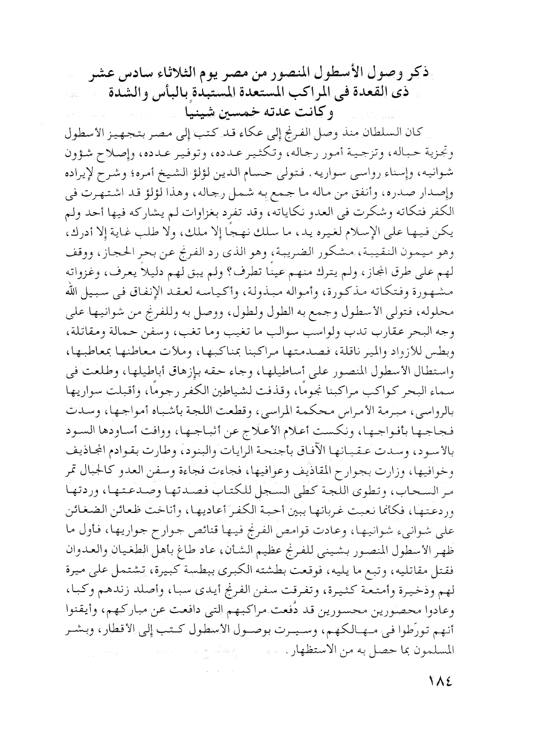 ذكر وصول الأسطول المنصور من مصريوم الثلاثاء سادس عشر ذي القعدة في المراكب المستعدة المستبدة بالبأس والشدة وكانت عدته خمسين شينيا