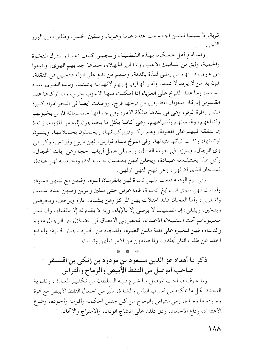 ولما عرف صاحب الموصل ما شرع فيه السلطان من تكثير العدة؛ وتقوية النجدة؛ لكل ما يمكنه من أسباب البأس والشدة؛ سير من أعمال النفط الأبيض مع عزة وجوده ما وجده. ومن التراس والرماح من كل جنس أحكمه وأقومه وأجوده. وشاع الاعتداد، وذاع الإحماد؛ ودل ذلك على اتشاج الوداد؛ والامتزاج والاتحاد.