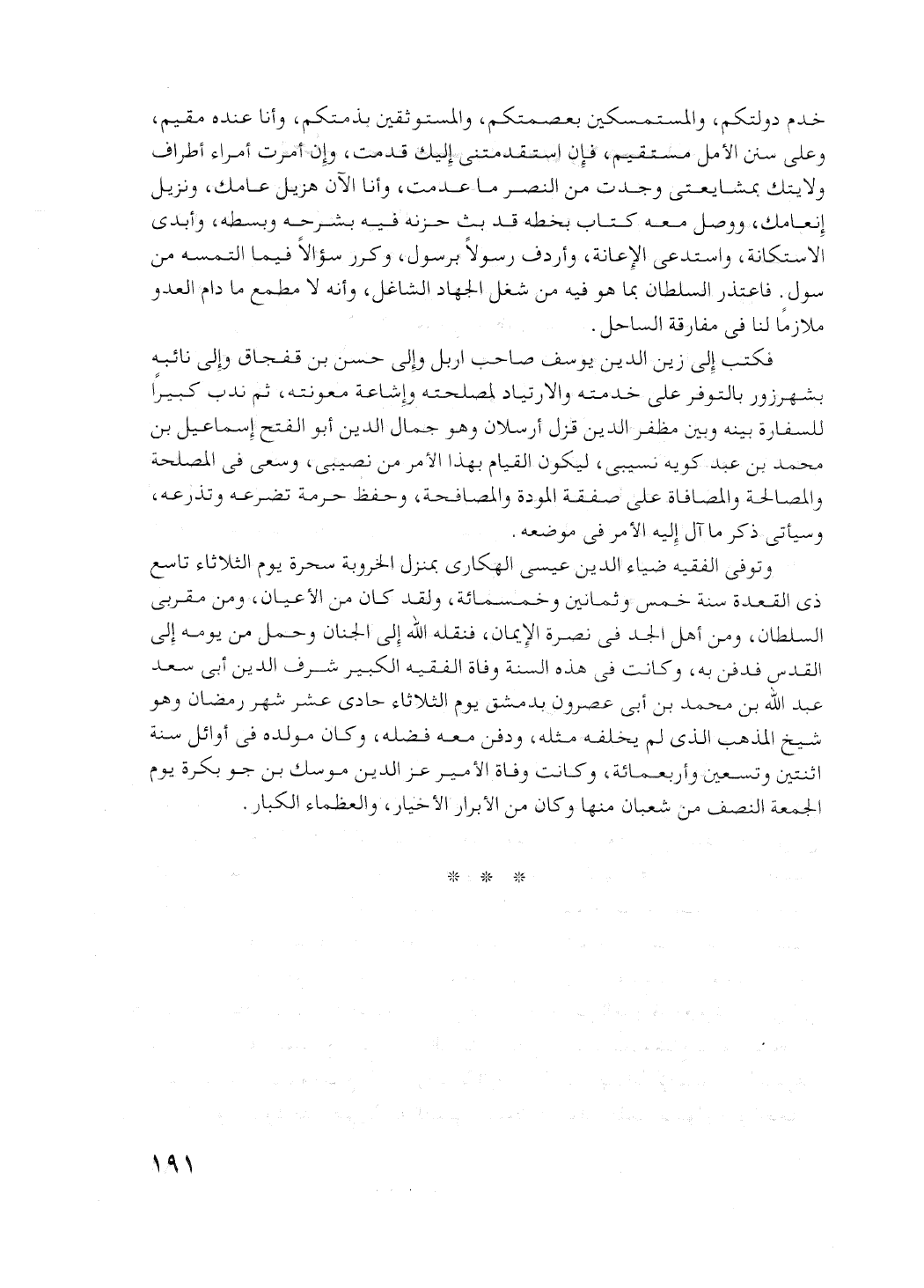 وتوفي الفقيه (ضياء الدين عيسى الهكاري) بمنزل الخروبة سحرة يوم الثلاثاء تاسع ذي القعدة سنة خمس وثمانين وخمسمائة. ولقد كان من الأعيان، ومن مقربي السلطان، ومن أهل الجد في نصره الإيمان، فنقله الله إلى الجنان. وحمل من يومه إلى القدس فدفن به.