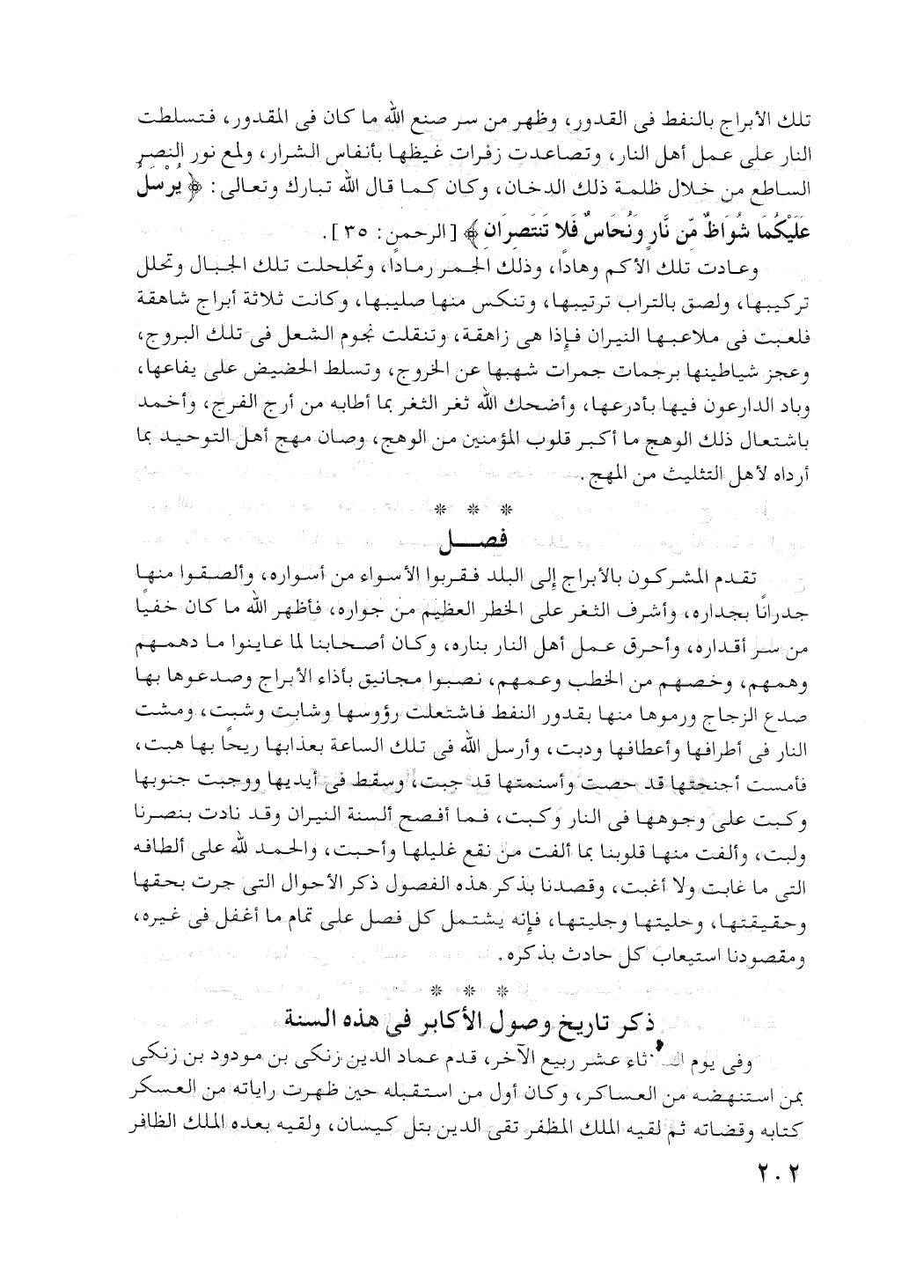 وعادت تلك الأكم وهادا، وذلك الجمر رمادا. وتحلحلت تلك الجبال وتحلل تركيبها، ولصق بالتراب ترتيبها، وتنكس منها صليبها. وكانت ثلاثة أبراج شاهقة، فلعبت في ملاعبها النيران فإذا هي زاهقة، وتنقلت نجوم الشعل في تلك البروج، وعجز شياطينها برجمات جمرات شهبها عن الخروج. وتسلط الحضيض على يفاعها، وباد الدارعون فيها بأدراعها. وأضحك الله ثغر الثغر بما أطابه من أرج الفرج، وأخمد باشتعال ذلك الوهج ما أكرب قلوب المؤمنين من الوهج، وصان مهج أهل التوحيد بما أراده لأهل التثليث من المهج.