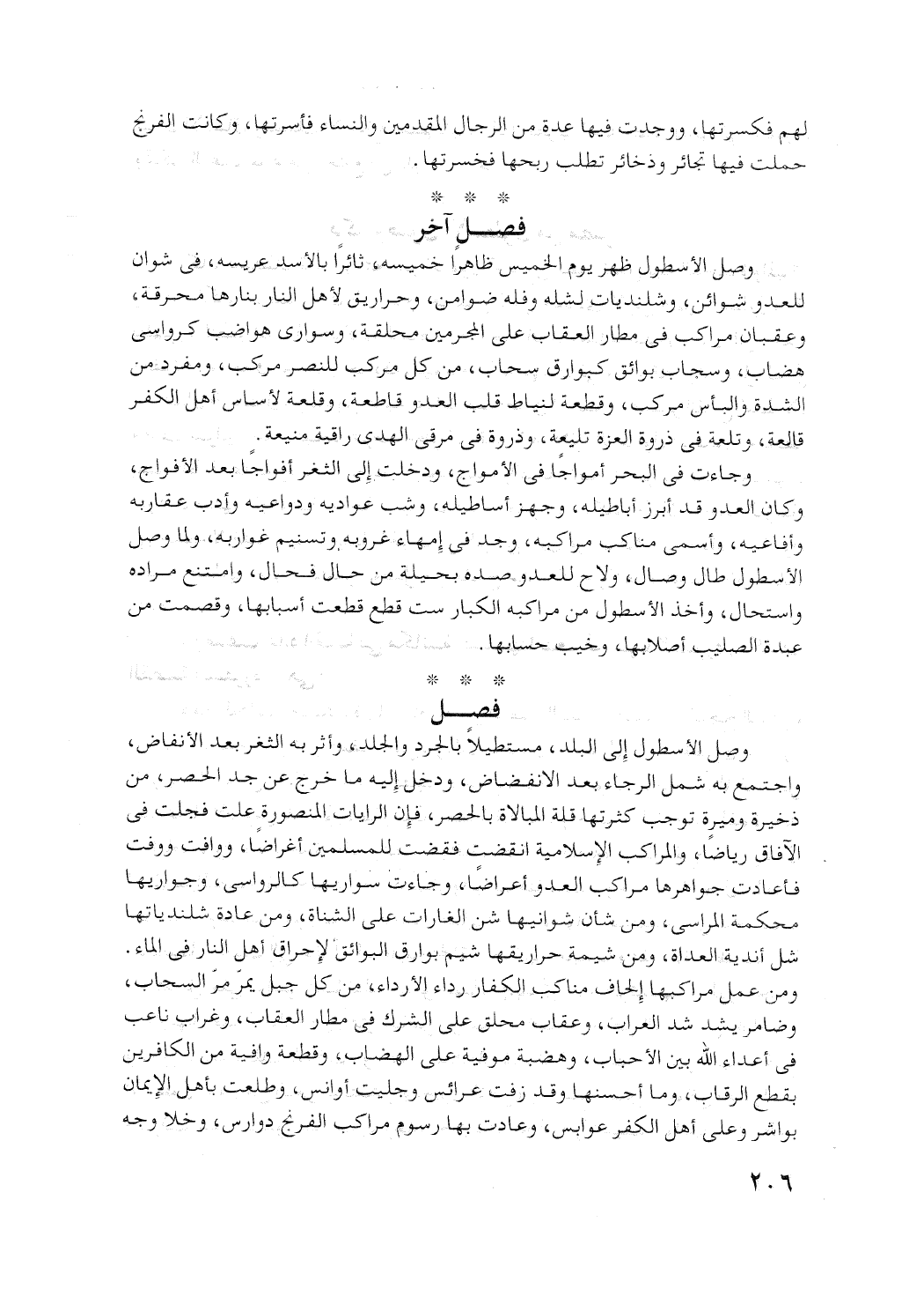 من كل مركب للنصر مركب، ومفرد من الشدة والبأس مركب. وقطعة لنياط قلب العدو قاطعه، وقلعة لأساس أهل الكفر قالعة. وتلعة في ذروة العزة تليعة، وذروة في مرقى الهدى راقية منيعة. وجاءت في البحر أمواجا في الأمواج، ودخلت إلى الثغر أفواجا بعد الأفواج.