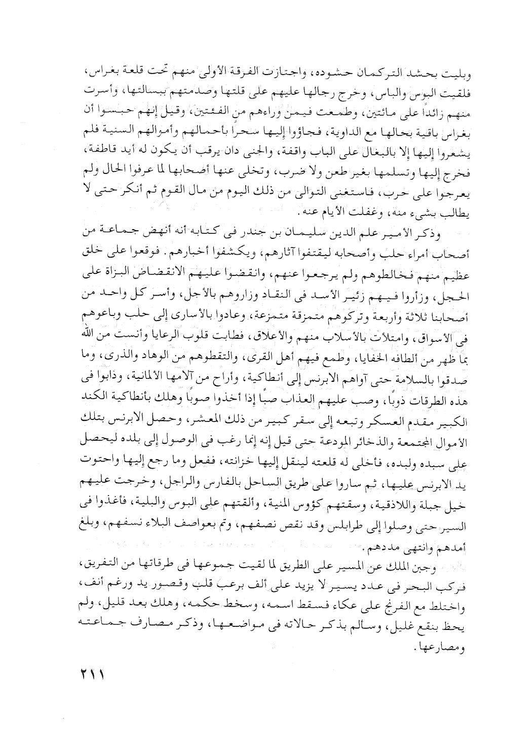 وذكر (الأمير علم الدين سليمان بن جندر) في كتابه؛ إنه انهض جماعة من أصحاب أمراء حلب وأصحابه؛ ليقتفوا آثارهم، ويكشفوا أخبارهم. فوقعوا على خلق عظيم منهم، فخالطوهم ولم يرجعوا عنهم. وانقضوا عليهم انقضاض البزاة على الحجل، وزأروا فيهم زئير الأسد في النقاد وزاروهم بالأجل. وأسر كل واحد من أصحابنا ثلاثة واربعة، وتركوهم متمزقة متمزعة. وعادوا بالأسارى إلى حلب وباعوهم في الأسواق، وامتلأت بالأسلاب منهم والاعلاق. فطابت قلوب الرعايا، وأنست من الله بما ظهر من ألطافه الخفايا. وطمع فيهم أهل القرى، والتقطوهم من الوهاد والذرا. وما صدقوا بالسلامة حتى آواهم الابرنس إلى إنطاكية، وأراح من آلامها الألمانية. وذابوا في هذه الطرقات ذوبا، وصب عليهم العذاب صبا إذا
