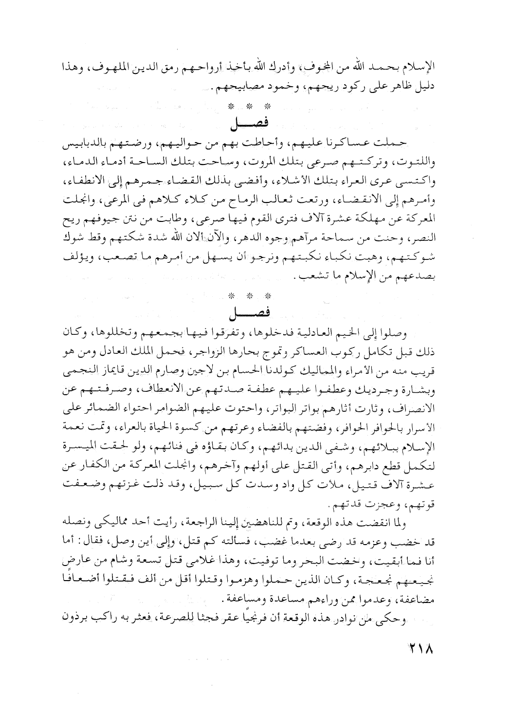وانجلت المعركة من الكفار عن عشرة آلاف قتيل، ملأت كل واد وسدت كل سبيل. وقد ذلت عوتهم، وضعفت قوتهم، وعجزت قدرتهم ولما انقضت هذه الوقعة؛ وتم لناهضين إلينا الرجعة؛ رأيت أحد مماليكي ونصله قد خضب، وعزمه قد رضى بعد ما غضب. فسألته كم قتل؛ وإلى أين وصل؛ فقال: أما أنا فما أبقيت، وخضت البحر وما توقيت. وهذا غلامي قتل تسعة، وشام من عارض نجيعهم نجعة. وكان الذين حملوا، وهزموا وقتلوا وقتلوا أقل من ألف. فقتلوا أضعافا مضاعفة، وعدموا ممن وراءهم مساعدة ومساعفة.
