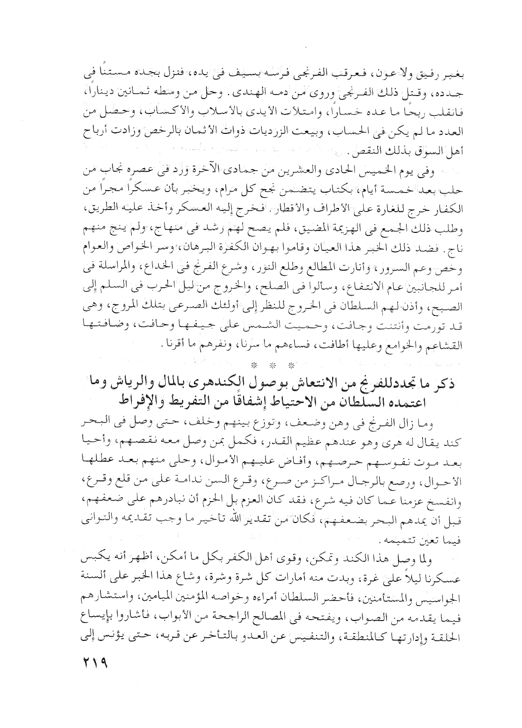 بغير رفيق ولا عون. فعرقب الفرنجي فرسه بسيف في يده، فنزل بجده مستنا في جدده. وقتل ذلك الفرنجي وروى من دمه الهندي، وحل من وسطه ثمانين دينارا. فانقلب ربحا ما عده خسارا. وامتلأت الأيدي بالأسلاب والاكساب، وحصل من العدد ما لم يكن في الحساب. وبيعت الزرديات - ذوات الأثمان - بالرخص، وزادت أرباح أهل السوق بذلك النقص.