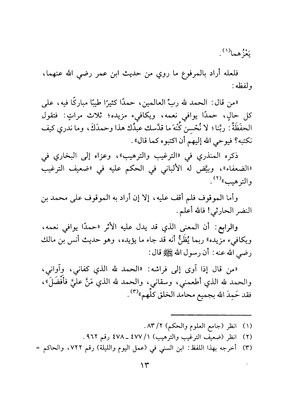 والرابع: أن المعنى الذي قد يدل عليه الأثر "حمدًا يوافي نعمه، ويكافيء مزيده" ربما يُظَنُّ أنه قد جاء ما يؤيده، وهو حديث أنس بن مالك رضي الله عنه: أن رسول الله - صلى الله عليه وسلم - قال: