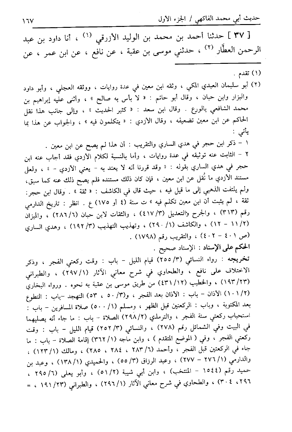 37 - حَدَّثَنَا أَحْمَدُ بْنُ مُحَمَّدِ بْنِ الْوَلِيدِ الْأَزْرَقِيُّ، أنا دَاوُدُ بْنُ عَبْدِ الرَّحْمَنِ الْعَطَّارُ، حَدَّثَنِي مُوسَى بْنُ عُقْبَةَ، عَنْ نَافِعٍ، عَنِ ابْنِ عُمَرَ، عَنْ -[168]- حَفْصَةَ، أَنَّهَا أَخْبَرَتْهُ أَنَّ النَّبِيَّ صَلَّى اللهُ عَلَيْهِ وَسَلَّمَ: «كَانَ §إِذَا أَذَّنَ الْمُؤَذِّنُ لِصَلَاةِ الصُّبْحِ سَجَدَ سَجْدَتَيْنِ قَبْلَ صَلَاةِ الصُّبْحِ»