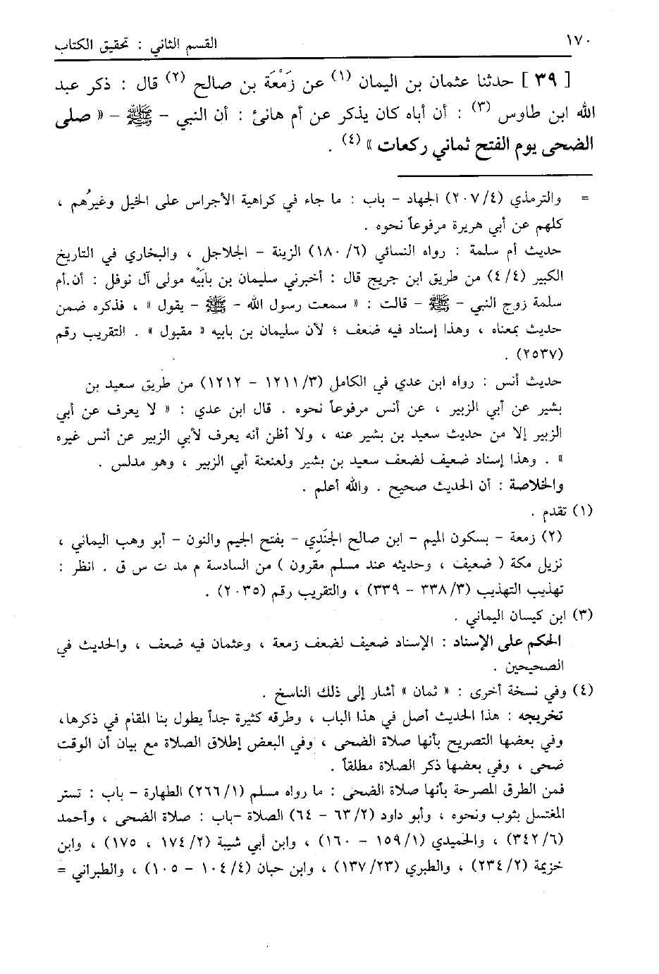 39 - حَدَّثَنَا عُثْمَانُ بْنُ الْيَمَانِ، عَنْ زَمْعَةَ بْنِ صَالِحٍ، قَالَ: ذَكَرَ عَبْدُ اللَّهِ بْنُ طَاوُسٍ , أَنَّ أَبَاهُ كَانَ يَذْكُرُ , عَنْ أُمِّ هَانِئٍ: أَنَّ النَّبِيَّ صَلَّى اللهُ عَلَيْهِ وَسَلَّمَ «§صَلَّى الضُّحَى يَوْمَ الْفَتْحِ ثَمَانِيَ رَكَعَاتٍ»