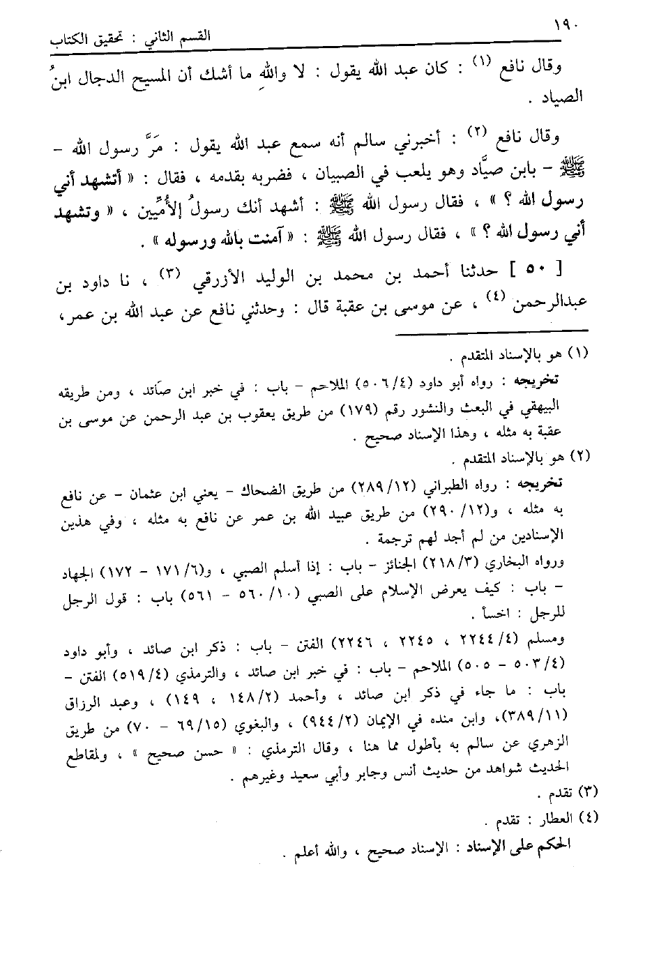 وَقَالَ نَافِعٌ: أَخْبَرَنِي سَالِمٌ أَنَّهُ سَمِعَ عَبْدَ اللَّهِ يَقُولُ: مَرَّ رَسُولُ اللَّهِ صَلَّى اللهُ عَلَيْهِ وَسَلَّمَ بِابْنِ صَيَّادٍ وَهُوَ يَلْعَبُ فِي الصِّبْيَانِ، فَضَرَبَهُ بِقَدَمِهِ، فَقَالَ: «§أَتَشْهَدُ أَنِّي رَسُولُ اللَّهِ؟» َقَالَ: أَشْهَدُ أَنَّكَ رَسُولُ الْأُمِّيِّينَ، وَتَشْهَدُ أَنِّي رَسُولُ اللَّهِ؟ فَقَالَ رَسُولُ اللَّهِ صَلَّى اللهُ عَلَيْهِ وَسَلَّمَ: «آمَنْتُ بِاللَّهِ وَرَسُولِهِ»