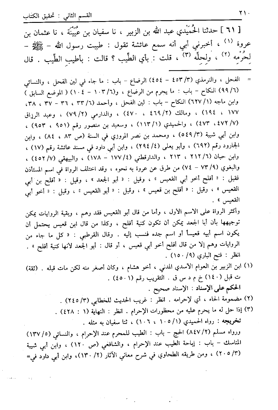 61 - حَدَّثَنَا الْحُمَيْدِيُّ عَبْدُ اللَّهِ بْنُ الزُّبَيْرِ، نا سُفْيَانُ بْنُ عُيَيْنَةَ، نا عُثْمَانُ بْنُ عُرْوَةَ، أَخْبَرَنِي أَبِي أَنَّهُ، سَمِعَ عَائِشَةَ، تَقُولُ: §طَيَّبْتُ رَسُولَ اللَّهِ صَلَّى اللهُ عَلَيْهِ وَسَلَّمَ لِحُرْمِهِ وَلِحِلِّهِ، قُلْتُ: بِأَيٍّ الطِّيبِ؟ قَالَتْ: بِأَطْيَبِ الطِّيبِ قَالَ -[211]- سُفْيَانُ: وَقَالَ لِي عُثْمَانُ بْنُ عُرْوَةَ: مَا يَرْوِي هِشَامُ بْنُ عُرْوَةَ هَذَا الْحَدِيثَ إِلَّا عَنِّي