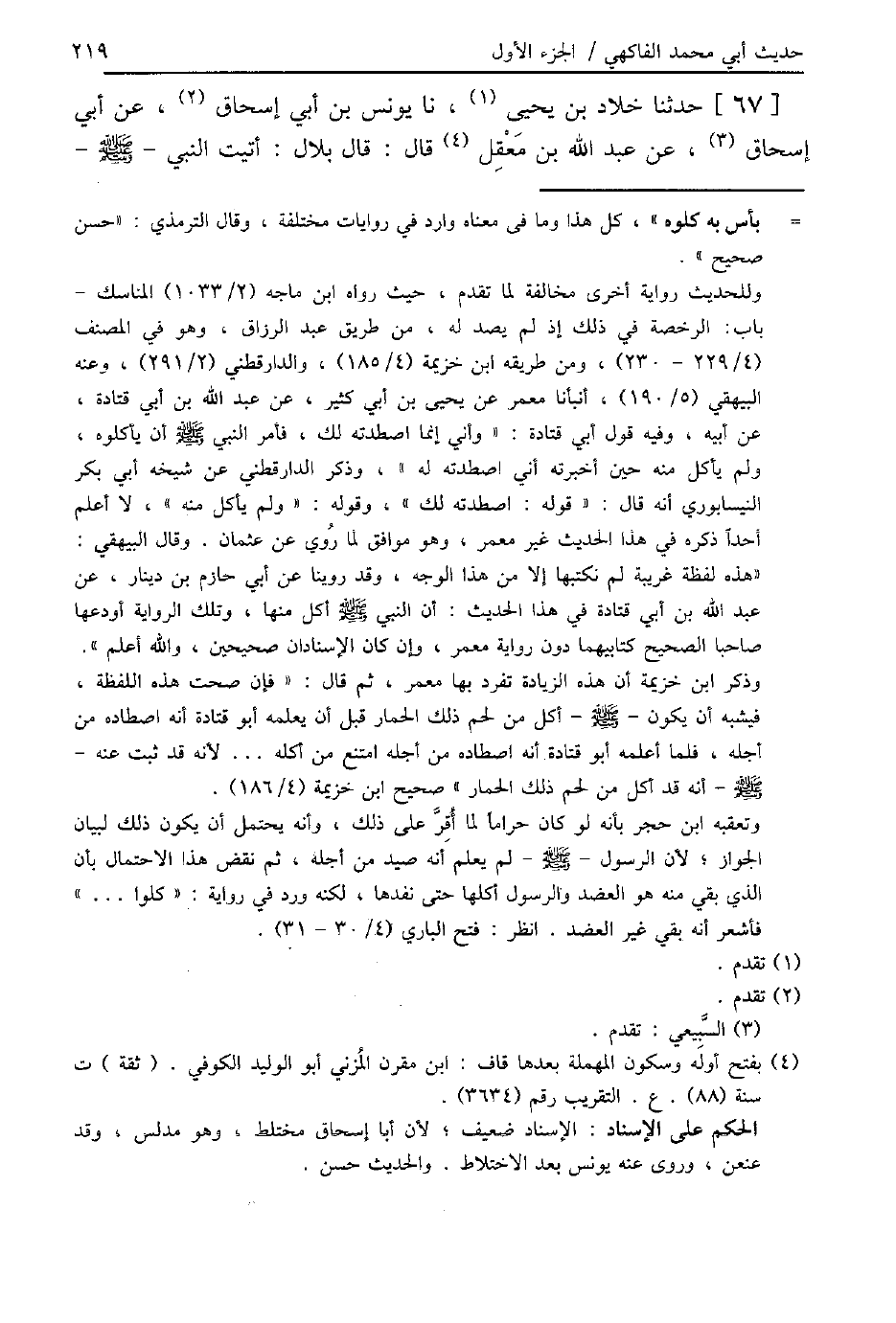 67 - حَدَّثَنَا خَلَّادُ بْنُ يَحْيَى، نا يُونُسُ بْنُ أَبِي إِسْحَاقَ، عَنْ أَبِي إِسْحَاقَ، عَنْ عَبْدِ اللَّهِ بْنِ مَعْقِلٍ، قَالَ: قَالَ بِلَالٌ: «أَتَيْتُ النَّبِيَّ صَلَّى اللهُ عَلَيْهِ وَسَلَّمَ -[220]- أُؤْذِنُهُ بِالصَّلَاةِ صَلَاةِ الْغَدَاةَ، §وَهُوَ يُرِيدُ الصِّيَامَ، فَدَعَا بِإِنَاءٍ فَشَرِبَ، ثُمَّ نَاوَلَنِي فَشَرِبْتُ، ثُمَّ خَرَجَ إِلَى الصَّلَاةِ»