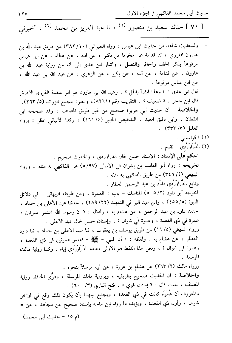 70 - حَدَّثَنَا سَعِيدُ بْنُ مَنْصُورٍ، نا عَبْدُ الْعَزِيزِ بْنُ مُحَمَّدٍ، أَخْبَرَنِي -[226]- هِشَامُ بْنُ عُرْوَةَ، عَنْ أَبِيهِ، عَنْ عَائِشَةَ، " أَنَّ النَّبِيَّ صَلَّى اللهُ عَلَيْهِ وَسَلَّمَ §اعْتَمَرَ ثَلَاثَ عُمَرَ: عَمْرَةً فِي شَوَّالٍ، وَعُمْرَتَيْنِ فِي ذِي الْقَعْدَةِ "