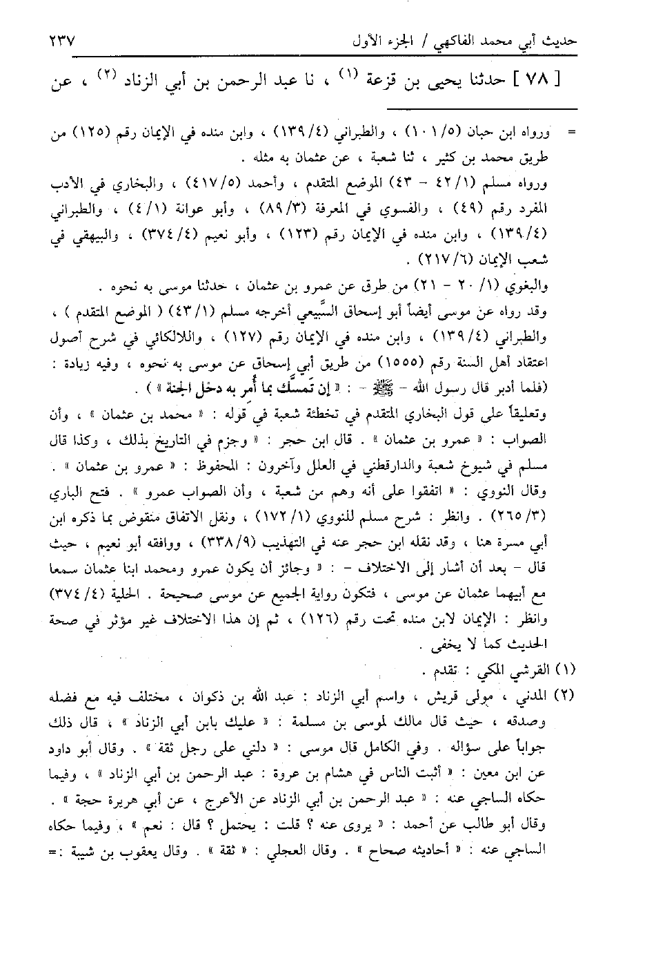 78 - حَدَّثَنَا يَحْيَى بْنُ قَزَعَةَ، نا عَبْدُ الرَّحْمَنِ بْنُ أَبِي الزِّنَادِ، عَنْ -[239]- أَبِيهِ، عَنْ خَارِجَةَ بْنِ زَيْدٍ، عَنْ أَبِيهِ، قَالَ: لَمَّا قَدِمَ النَّبِيُّ صَلَّى اللهُ عَلَيْهِ وَسَلَّمَ الْمَدِينَةَ أُتِيَ بِي إِلَيْهِ، فَقَرَأْتُ عَلَيْهِ، فَقَالَ لِي: «§تَعَلَّمْ كِتَابَ الْيَهُودِ، فَإِنِّي لَا آمَنْهُمْ عَلَى كِتَابِنَا» ، قَالَ: فَمَا مَرَّ بِي خَمْسَ عَشْرَةَ حَتَّى تَعَلَّمْتُهُ، فَكُنْتُ أَكْتُبُ لِلنَّبِيِّ صَلَّى اللهُ عَلَيْهِ وَسَلَّمَ وَأَقْرَأُ كُتُبِهِمْ إِلَيْهِ