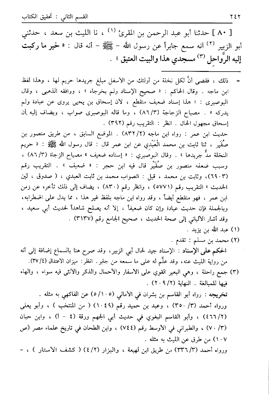 80 - حَدَّثَنَا أَبُو عَبْدِ الرَّحْمَنِ بْنُ الْمُقْرِئِ، نا اللَّيْثُ بْنُ سَعْدٍ، حَدَّثَنِي أَبُو الزُّبَيْرِ، أَنَّهُ سَمِعَ جَابِرًا، عَنْ رَسُولِ اللَّهِ صَلَّى اللهُ عَلَيْهِ وَسَلَّمَ أَنَّهُ قَالَ: «§خَيْرُ مَا رَكِبَتْ إِلَيْهِ الرَّوَاحِلُ مَسْجِدِي هَذَا وَالْبَيْتُ الْعَتِيقُ»