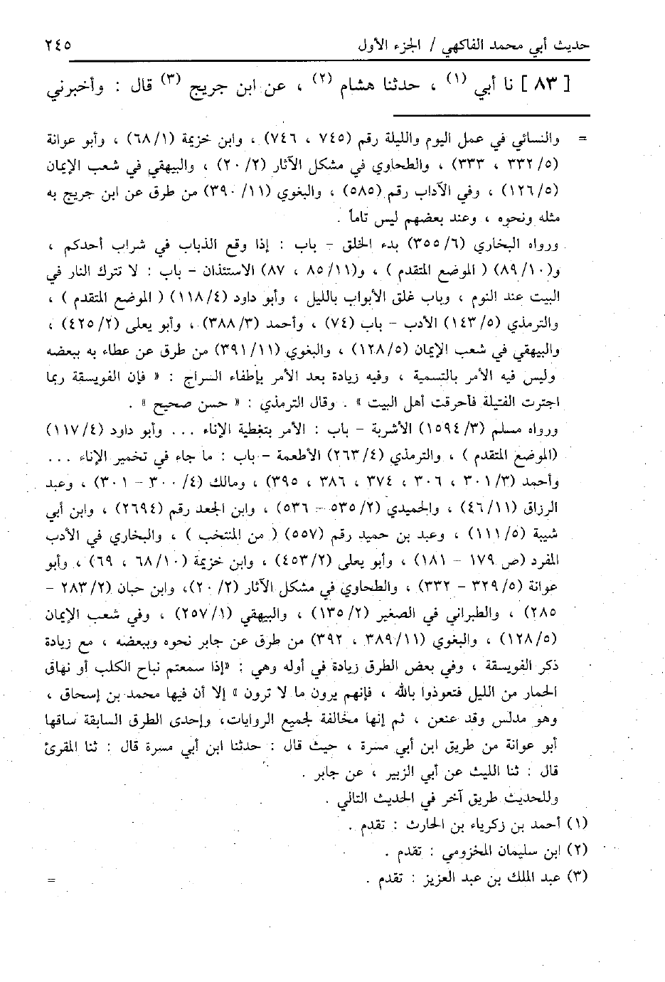 83 - نا أَبِي، حَدَّثَنَا هِشَامٌ، عَنِ ابْنِ جُرَيْجٍ، قَالَ: وَأَخْبَرَنِي -[246]- عَمْرُو بْنُ دِينَارٍ، أَنَّهُ سَمِعَ جَابِرَ بْنَ عَبْدِ اللَّهِ، يَقُولُ: قَالَ رَسُولُ اللَّهِ صَلَّى اللهُ عَلَيْهِ وَسَلَّمَ: «§إِذَا جَنْحَ اللَّيْلُ وَأَمْسَيْتُمْ فَكُفُّوا صِبْيَانَكُمْ» نَحْوًا مِمَّا أَخْبَرَ عَطَاءٌ عَنْ جَابِرٍ، أَيْ أَنَّهُ يَقُولُ: «اذْكُرُوا اسْمَ اللَّهِ عَزَّ وَجَلَّ عَلَيْهِ»
