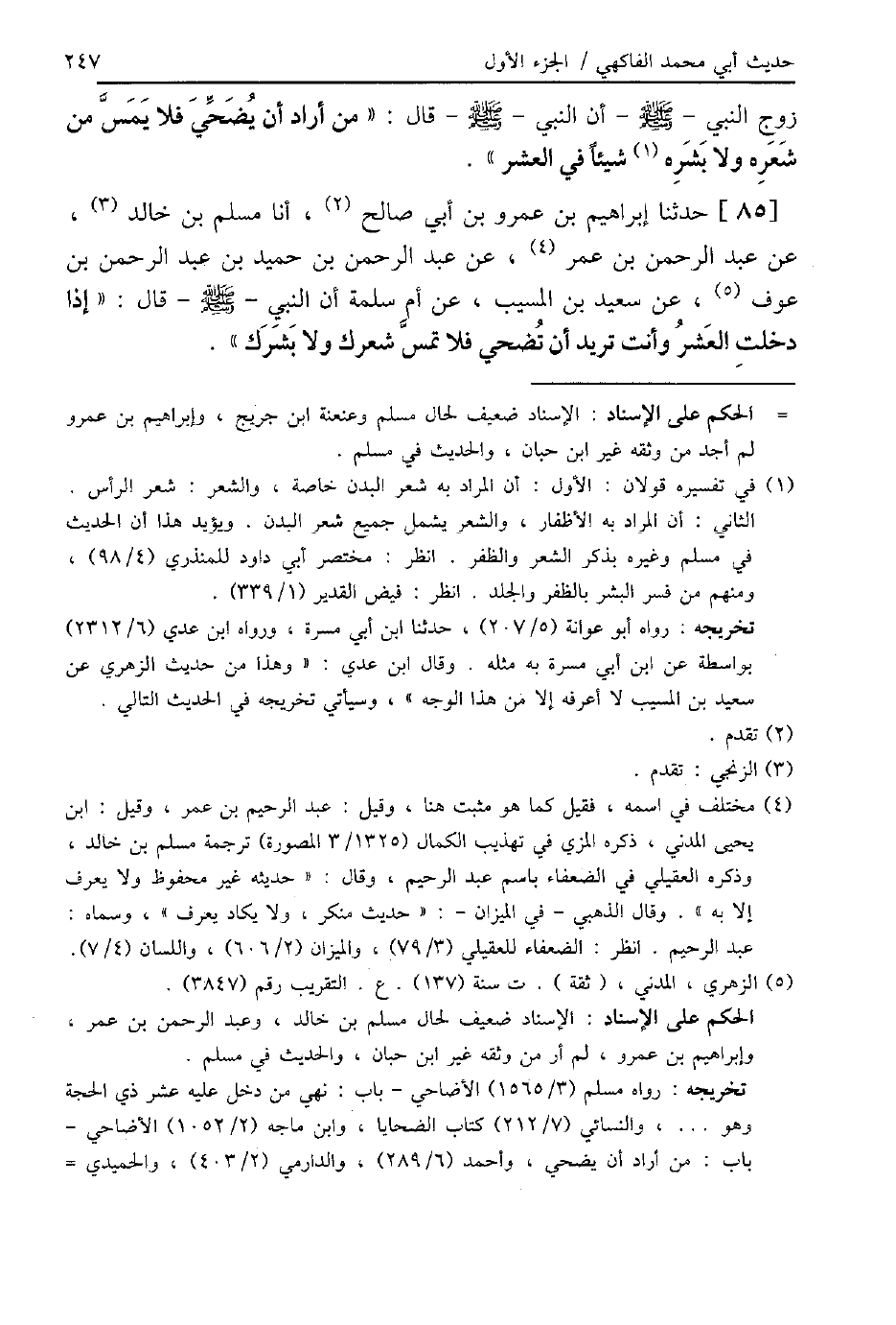 85 - حَدَّثَنَا إِبْرَاهِيمُ بْنُ عَمْرِو بْنِ أَبِي صَالِحٍ، أنا مُسْلِمُ بْنُ خَالِدٍ، عَنْ عَبْدِ الرَّحْمَنِ بْنِ عُمَرَ، عَنْ عَبْدِ الرَّحْمَنِ بْنِ حُمَيْدِ بْنِ عَبْدِ الرَّحْمَنِ بْنِ عَوْفٍ، عَنْ سَعِيدِ بْنِ الْمُسَيِّبِ، عَنْ أُمِّ سَلَمَةَ، أَنَّ النَّبِيَّ صَلَّى اللهُ عَلَيْهِ وَسَلَّمَ قَالَ: «§إِذَا دَخَلْتِ الْعَشْرُ وَأَنْتَ تُرِيدُ أَنْ تُضْحِيَ فَلَا تَمَسَّ شَعْرَكَ وَلَا بَشَرَكَ»