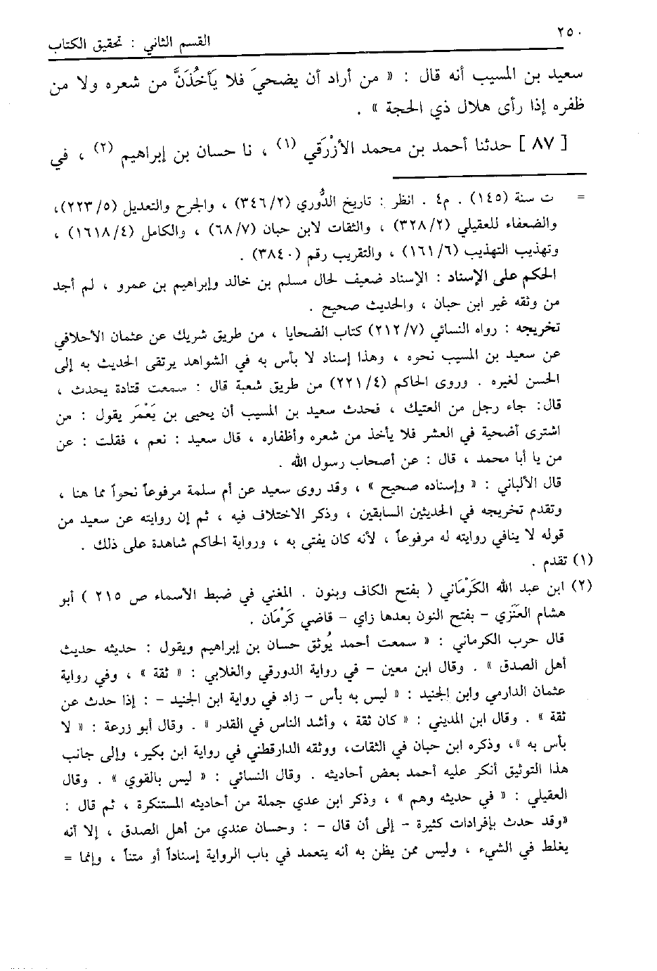 87 - حَدَّثَنَا أَحْمَدُ بْنُ مُحَمَّدٍ الْأَزْرَقِيُّ، نا حَسَّانُ بْنُ إِبْرَاهِيمَ، -[251]- فِي امْرَأَةٍ لَهَا مَالٌ تَسْتَأْذِنُ زَوْجَهَا فِي الْحَجِّ فَلَا يَأْذَنُ لَهَا؟ قَالَ إِبْرَاهِيمُ يَعْنِي الصَّائِغَ , قَالَ نَافِعٌ: قَالَ عَبْدُ اللَّهِ بْنُ عُمَرَ، عَنْ رَسُولِ اللَّهِ صَلَّى اللهُ عَلَيْهِ وَسَلَّمَ قَالَ: «لَيْسَ لَهَا أَنْ تَنْطَلِقَ إِلَّا بِإِذْنِ زَوْجِهَا، §وَلَا يَحِلُّ لِلْمَرْأَةِ أَنْ تُسَافِرَ ثَلَاثَ لَيَالٍ إِلَّا وَمَعَهَا ذُو مَحْرَمٍ تَحْرُمُ عَلَيْهِ»