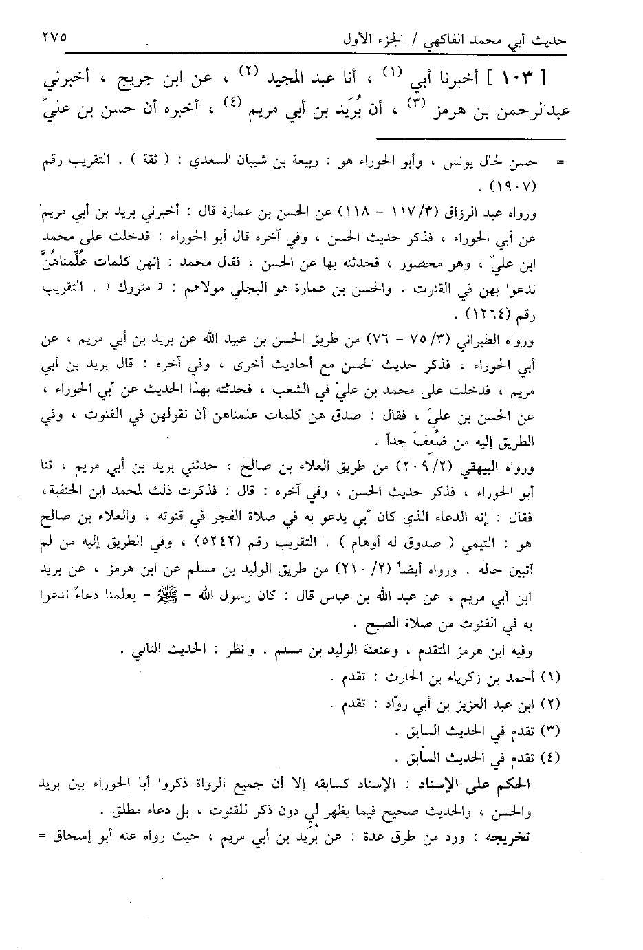 103 - أَخْبَرَنَا أَبِي، أنا عَبْدُ الْمَجِيدِ، عَنِ ابْنِ جُرَيْجٍ، أَخْبَرَنِي عَبْدُ الرَّحْمَنِ بْنُ هُرْمُزَ، أَنَّ بُرَيْدَ بْنَ أَبِي مَرْيَمَ أَخْبَرَهُ , أَنَّ حَسَنَ بْنَ عَلِيٍّ -[276]- قَالَ: عَقَلْتُ عَنْ رَسُولِ اللَّهِ صَلَّى اللهُ عَلَيْهِ وَسَلَّمَ دَعَوَاتٍ كَانَ يَدْعُو بِهِنَّ، وَأَمَرَنِي أَنْ أَدْعُوَ بِهِنَّ، وَأَنْ أَقَنُتَ بِهِنَّ: «اللَّهُمَّ §اهْدِنِي فِيمَنْ هَدَيْتَ، وَعَافِنِي فِيمَنْ عَافَيْتَ، وَتَوَلَّنِي فِيمَنْ تَوَلَّيْتَ، وَبَارِكْ لِي فِيمَا أَعْطَيْتَ، وَقِنِي شَرَّ مَا قَضَيْتَ، إِنَّكَ تَقْضِي وَلَا يُقْضَى عَلَيْكَ، إِنَّهُ لَا يَذِلُّ مَنْ وَالَيْتَ , تَبَارَكْتَ رَبَّنَا وَتَعَالَيتَ»